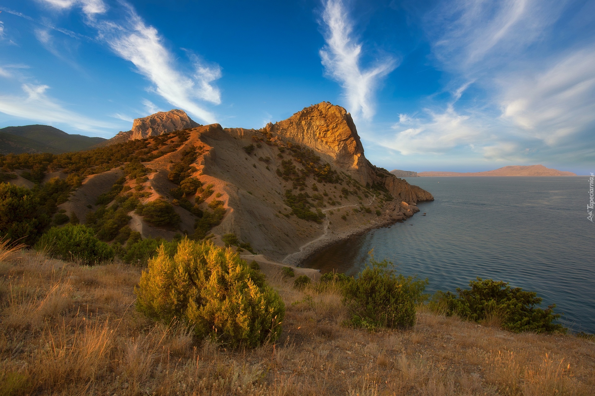 Edytor tapety: Trawa na wzgórzu i skały na morskim wybrzeżu