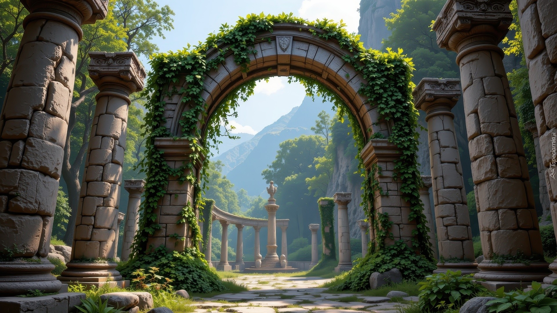 Edytor tapety: Kamienne kolumny i łuk porośnięty bluszczem