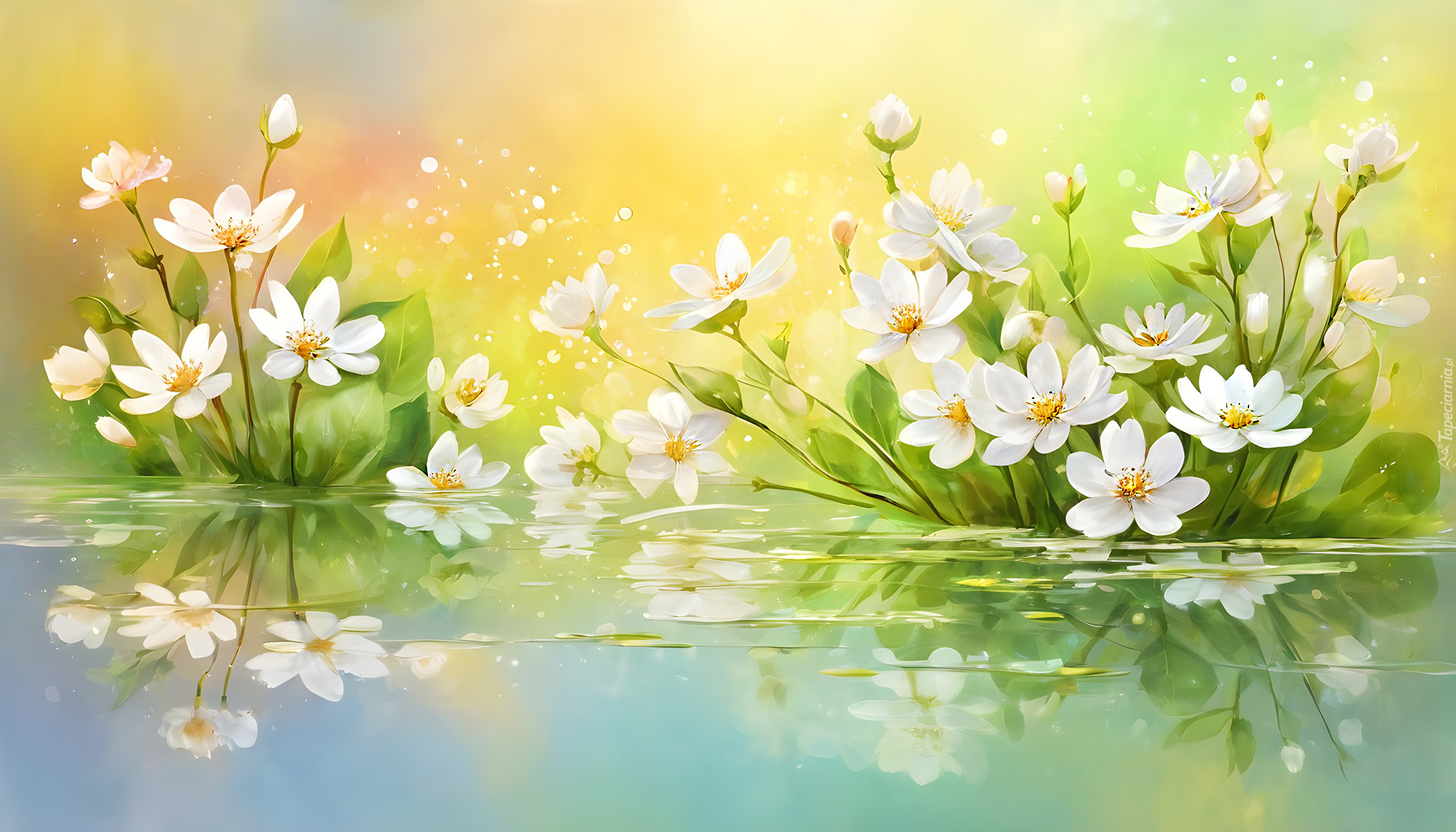 Edytor tapety: Odbicie w wodzie białych kwiatów
