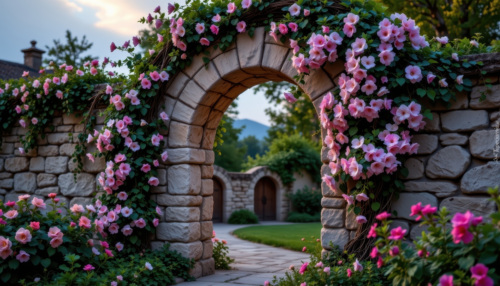 Edytor tapety: Kamienny łuk i mur opleciony pnącymi różowymi kwiatami