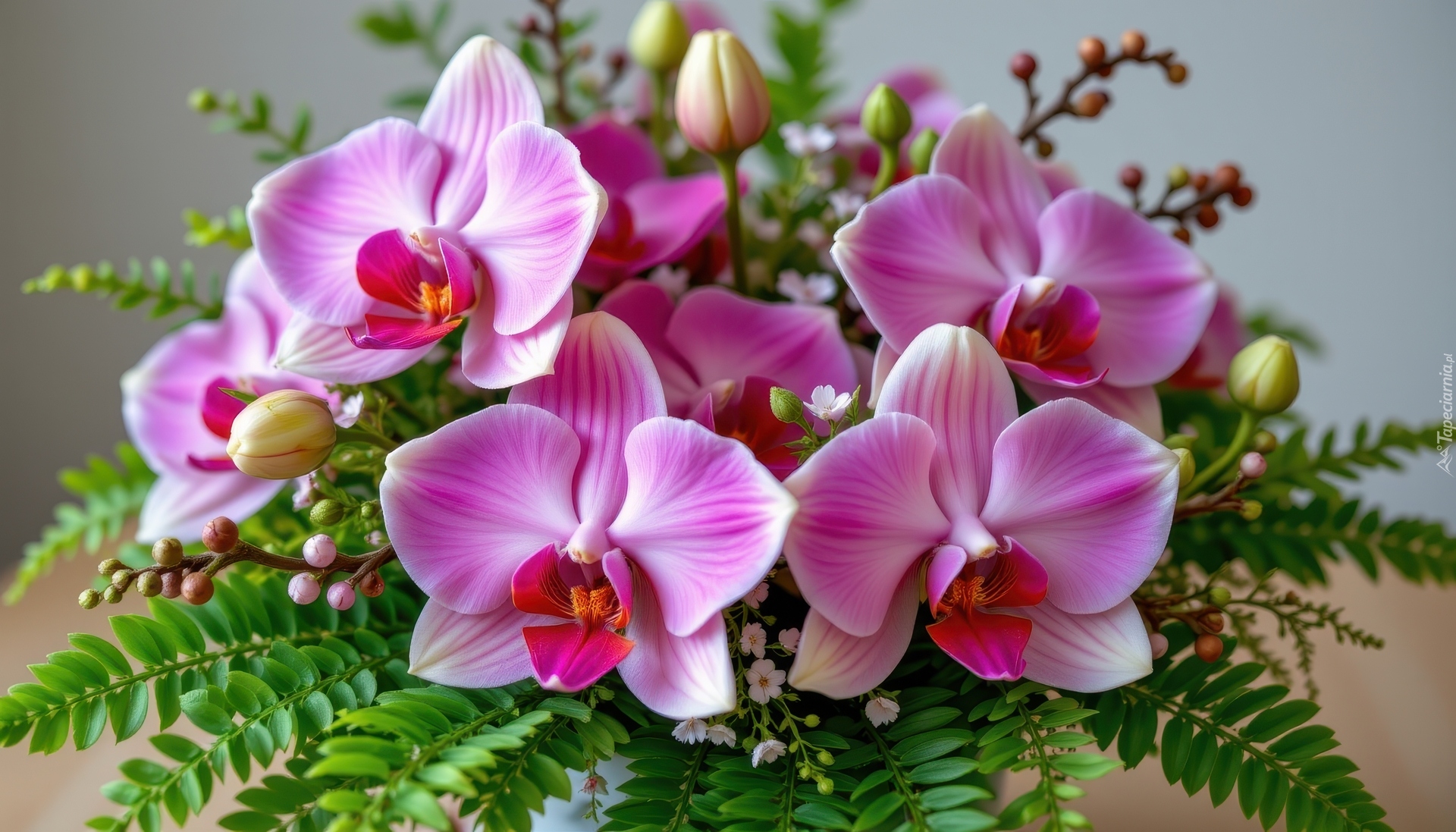 Edytor tapety: Różowe storczyki i liście paproci w bukiecie