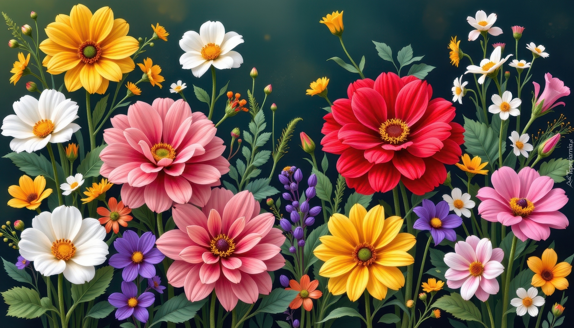 Edytor tapety: Różne kolorowe kwiaty z liśćmi na ciemnozielonym tle