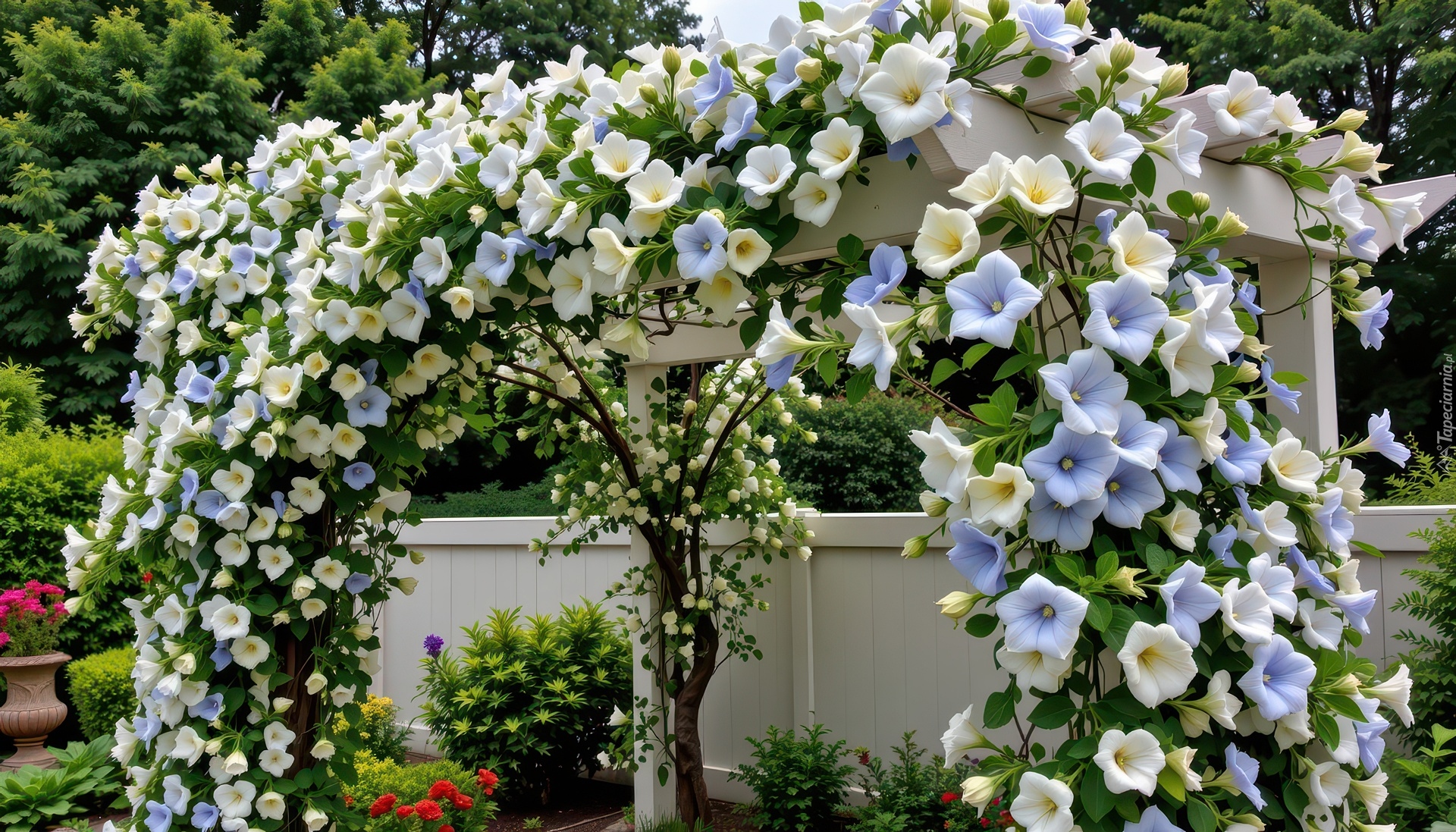 Edytor tapety: Pergola ogrodowa opleciona pnącymi kwiatami przy białym płocie