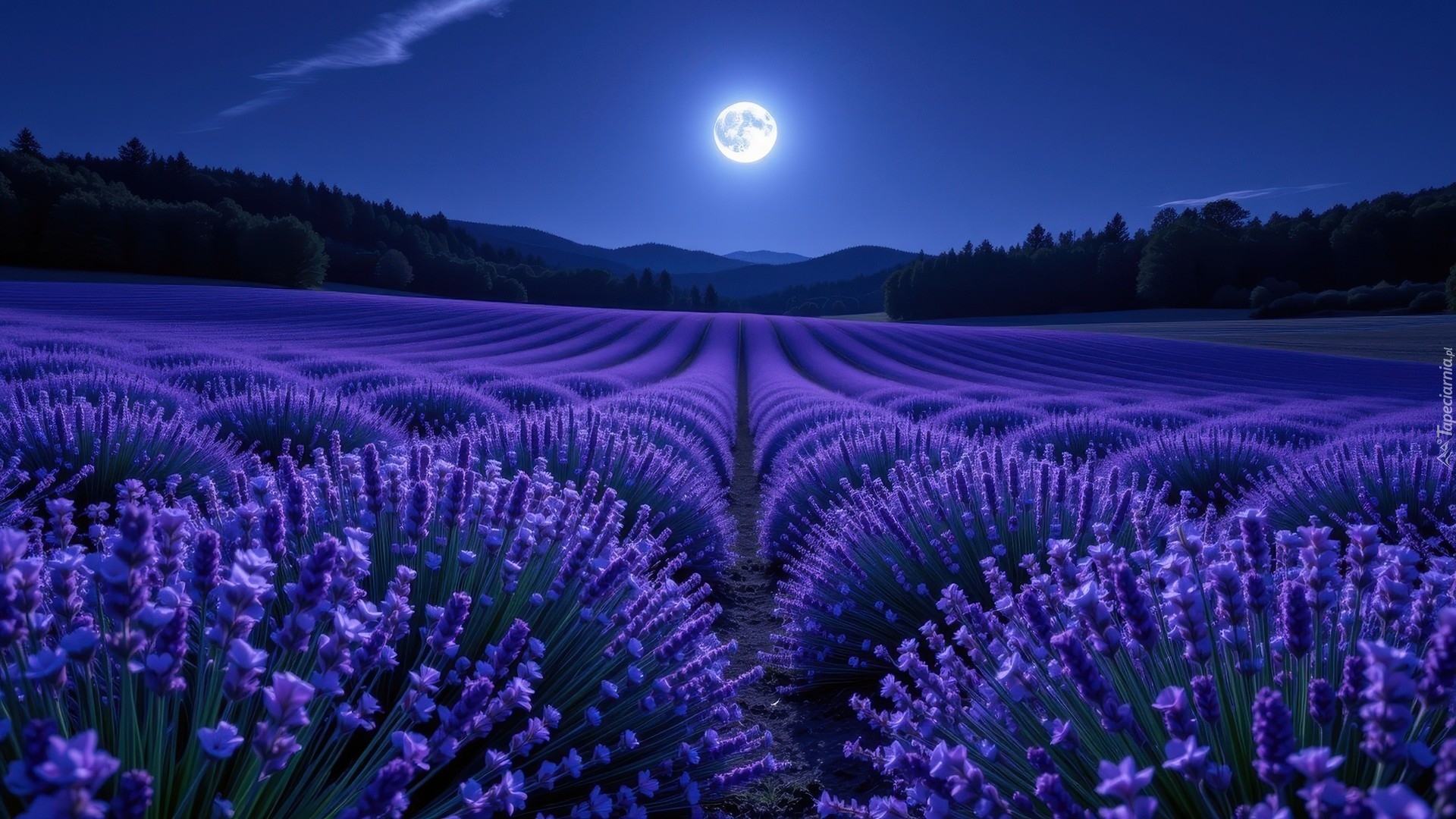 Edytor tapety: Księżyc nad polem lawendy i górami