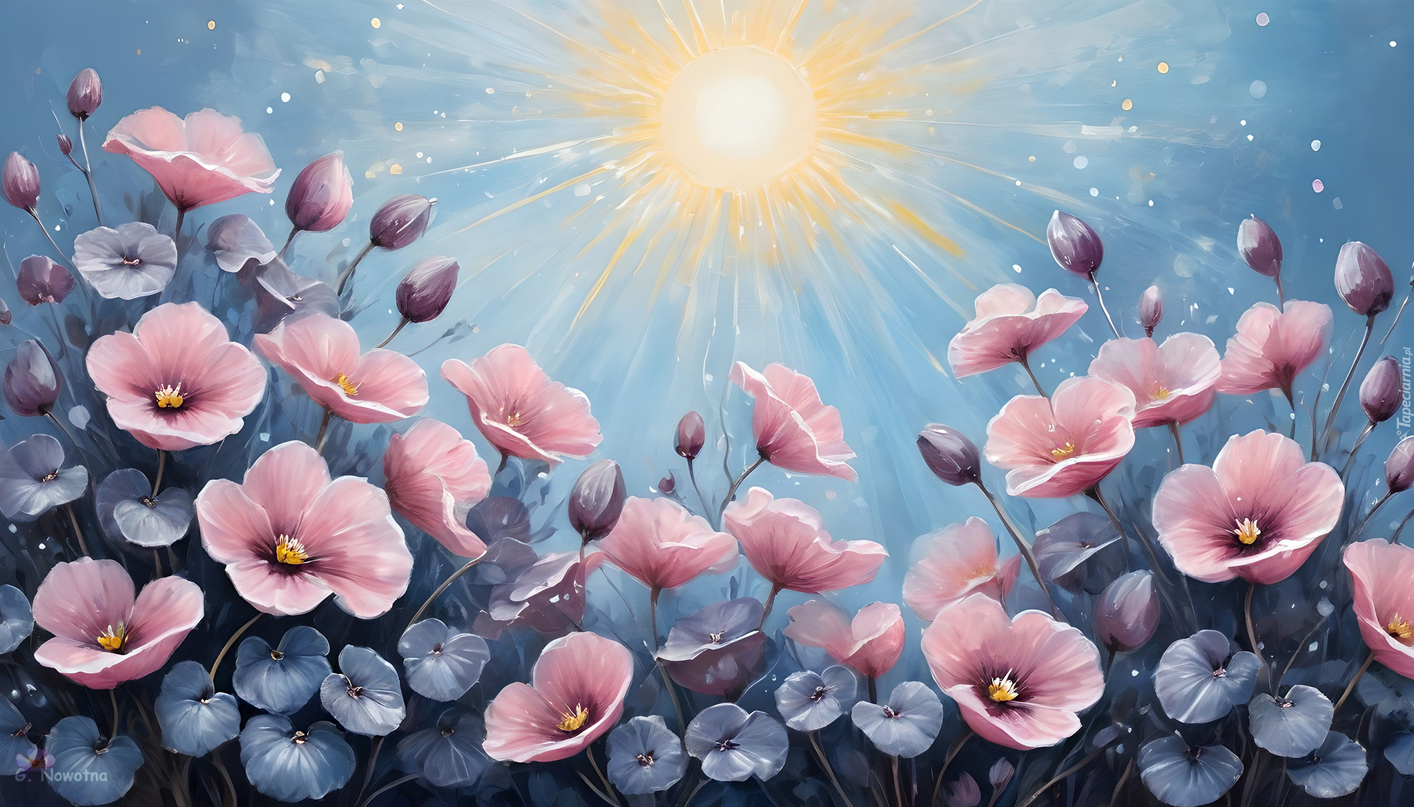 Edytor tapety: Różowe kwiaty i słońce na niebie