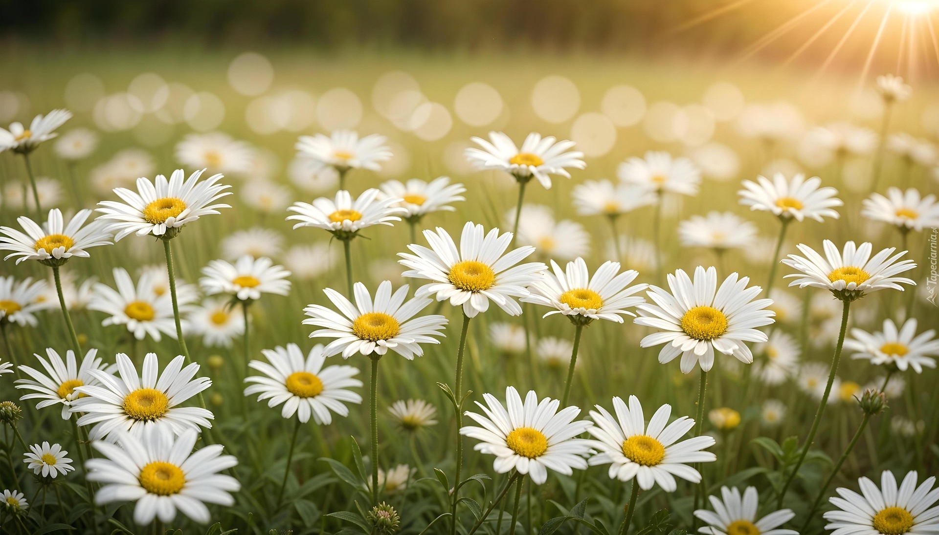Edytor tapety: Rozświetlone promieniami słońca białe stokrotki