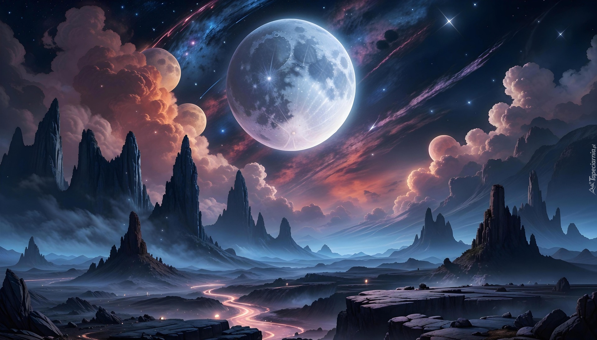 Edytor tapety: Księżyc i chmury nad górami w grafice fantasy