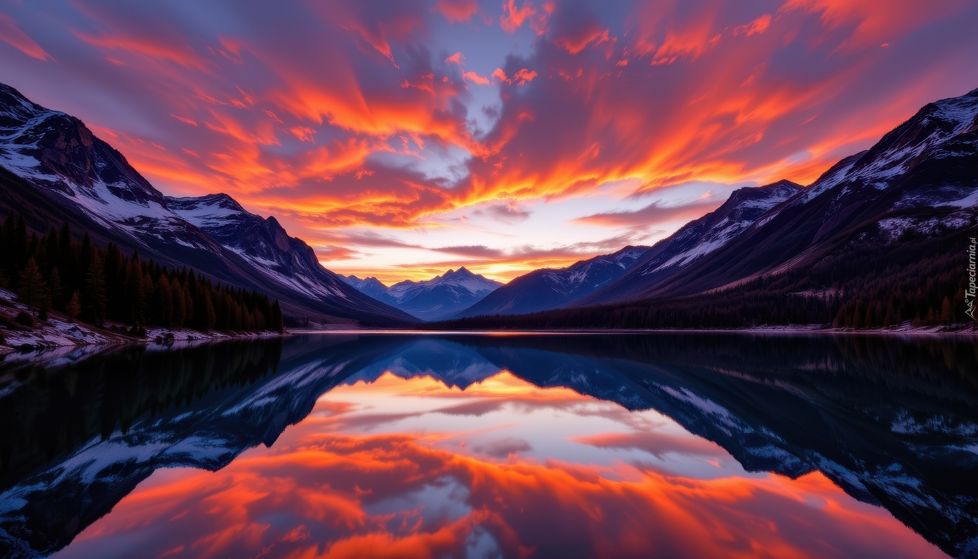 Edytor tapety: Odbicie kolorowych chmur zachodzącego słońca w górskim jeziorze