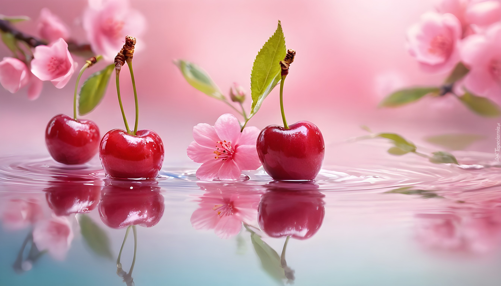 Edytor tapety: Odbicie w wodzie trzech czereśni oraz różowych kwiatów