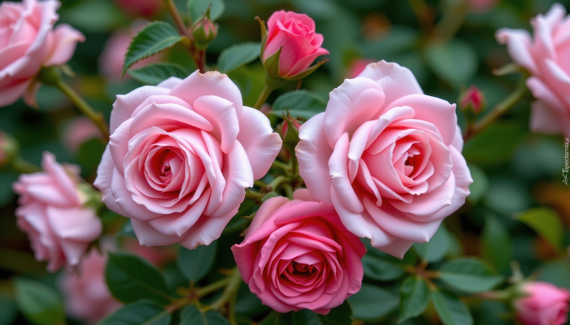 Edytor tapety: Rozkwitnięte różowe róże z pąkami w zbliżeniu
