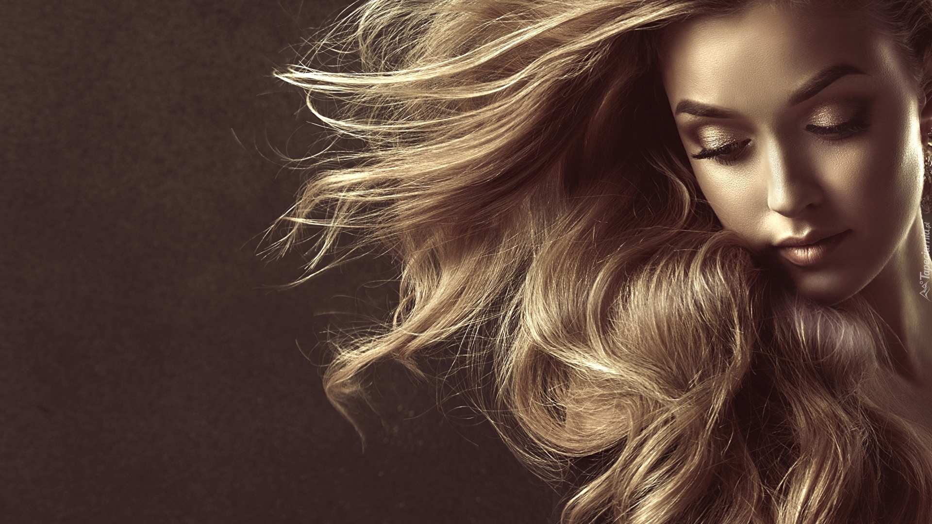 Edytor tapety: Twarz blondynki z rozwianymi długimi włosami