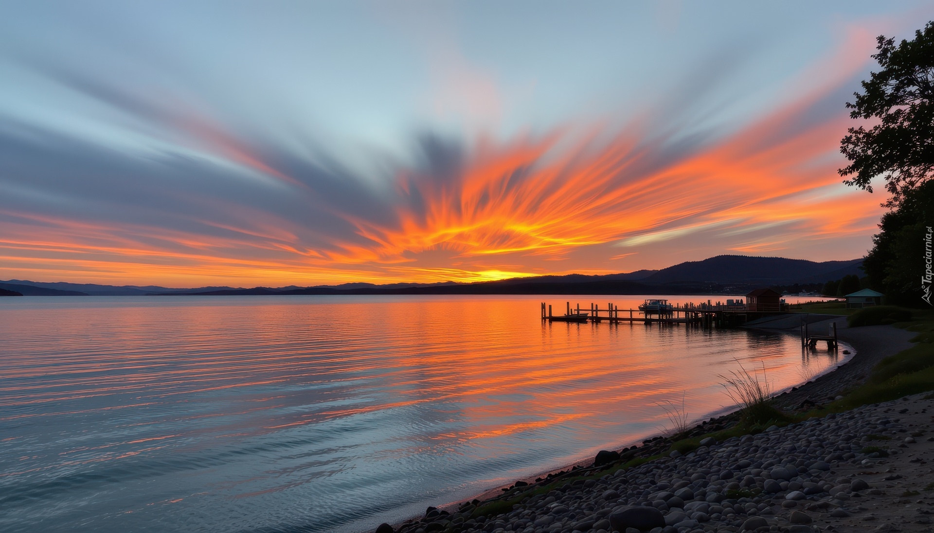 Edytor tapety: Pomost na tle malowniczego zachodu słońca nad jeziorem