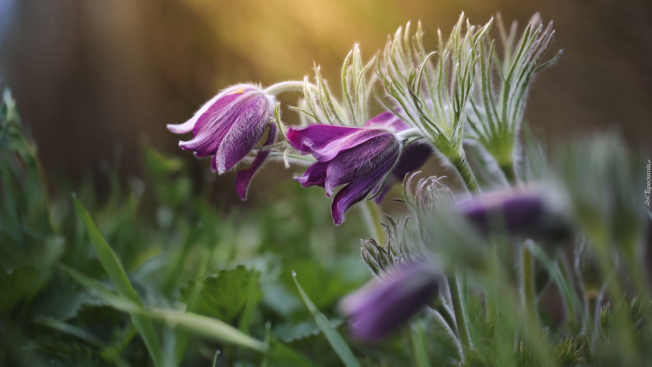 Edytor tapety: Pochylone fioletowe sasanki w zbliżeniu