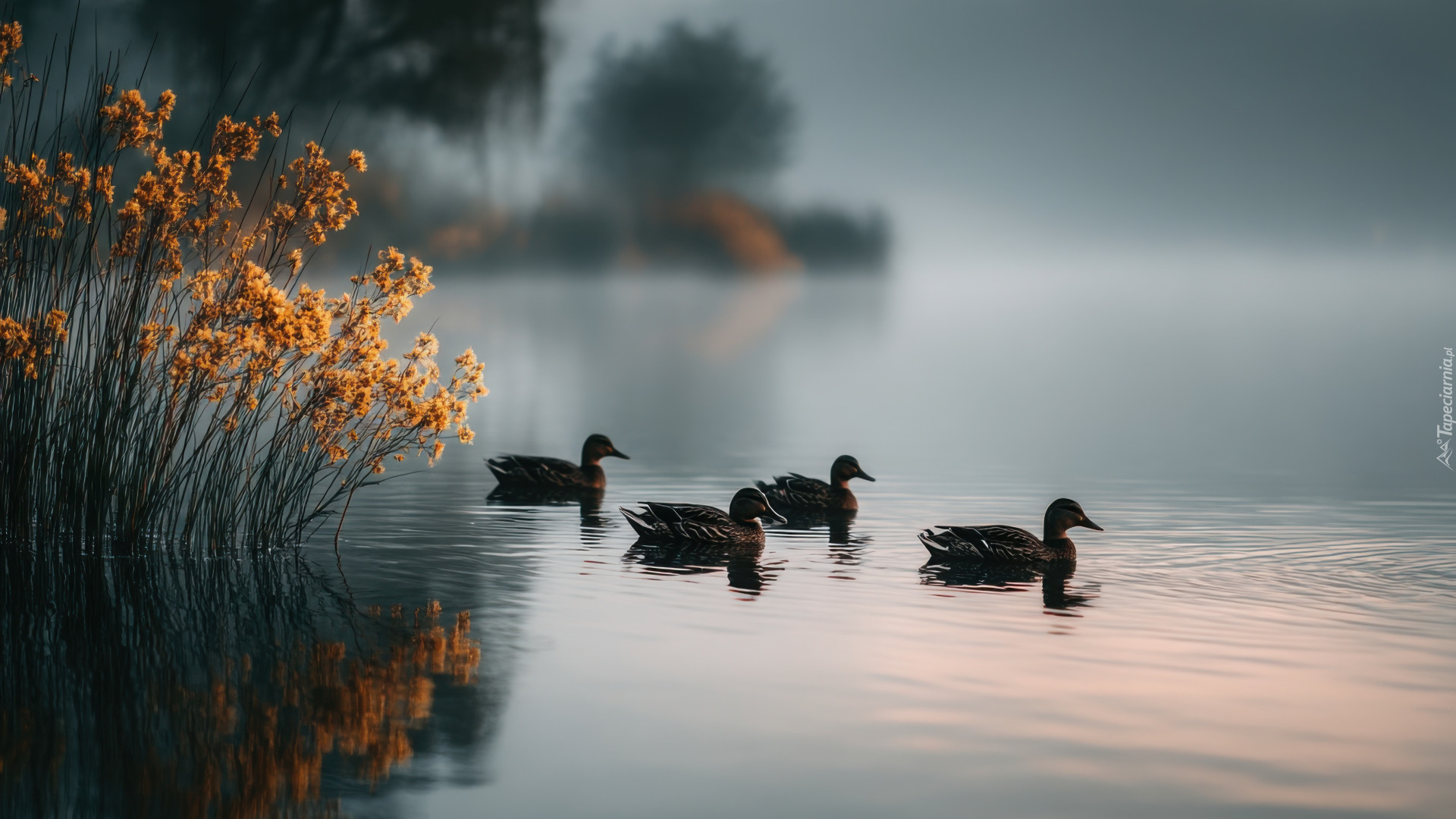 Edytor tapety: Kaczki i rośliny na zamglonym jeziorze o poranku