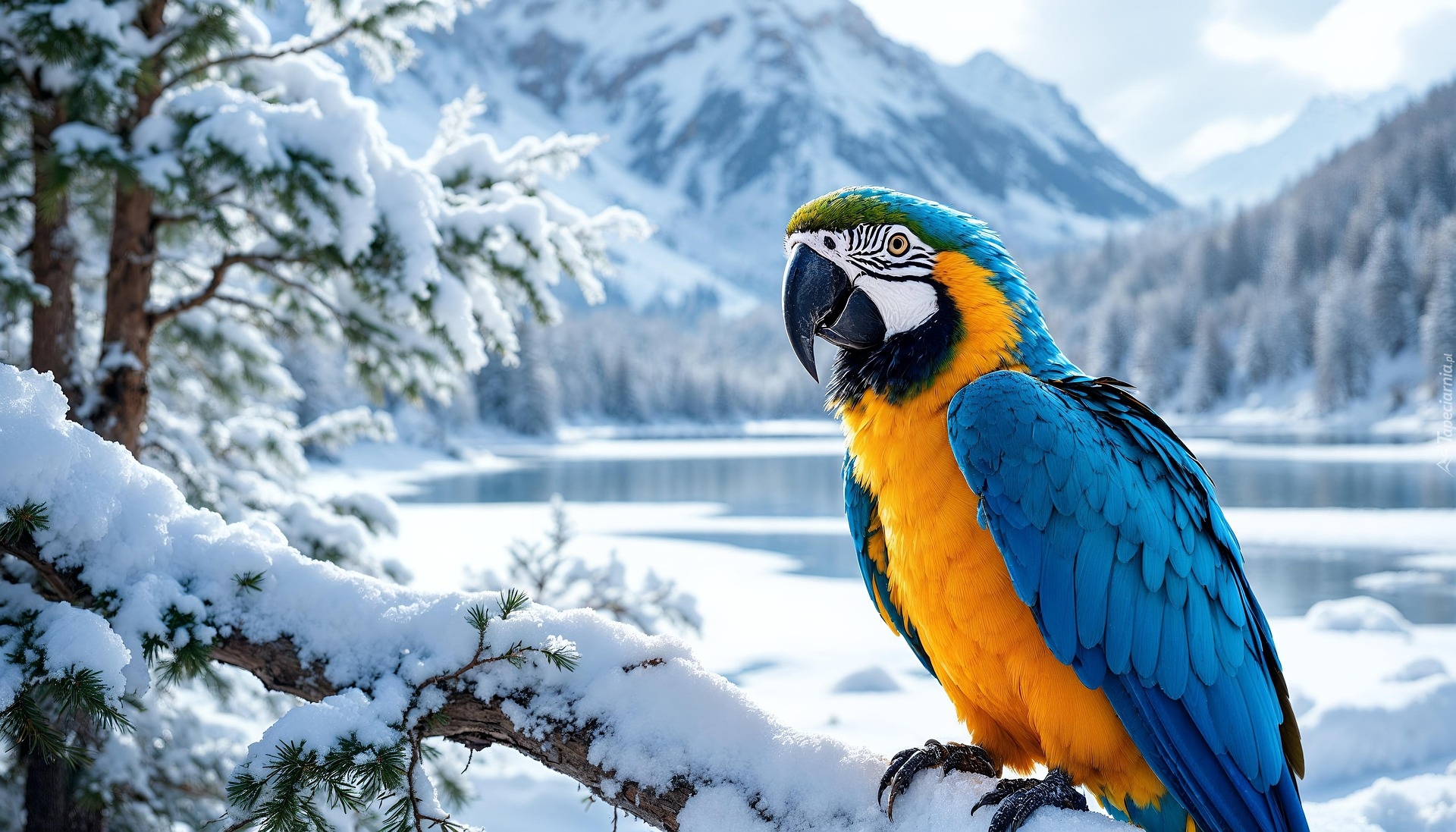 Edytor tapety: Niebiesko-żółta ara na ośnieżonej gałęzi