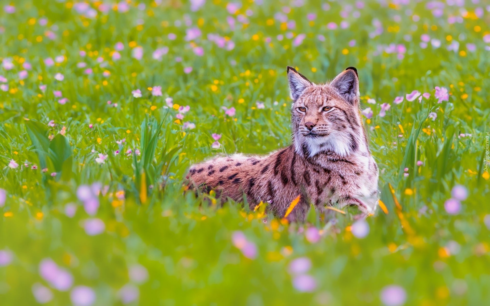 Edytor tapety: Ryś wśród kwiatów na łące