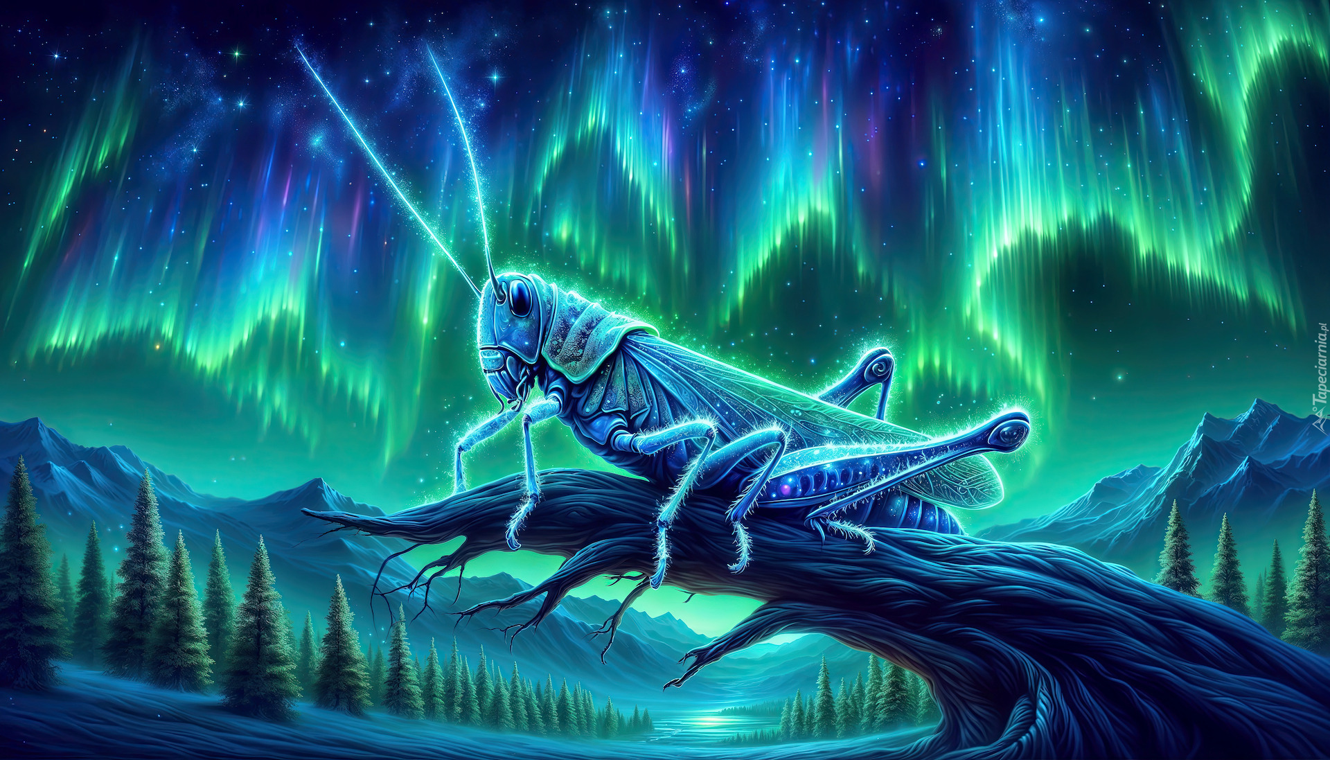 Edytor tapety: Grafika z konikiem polnym na tle zorzy polarnej