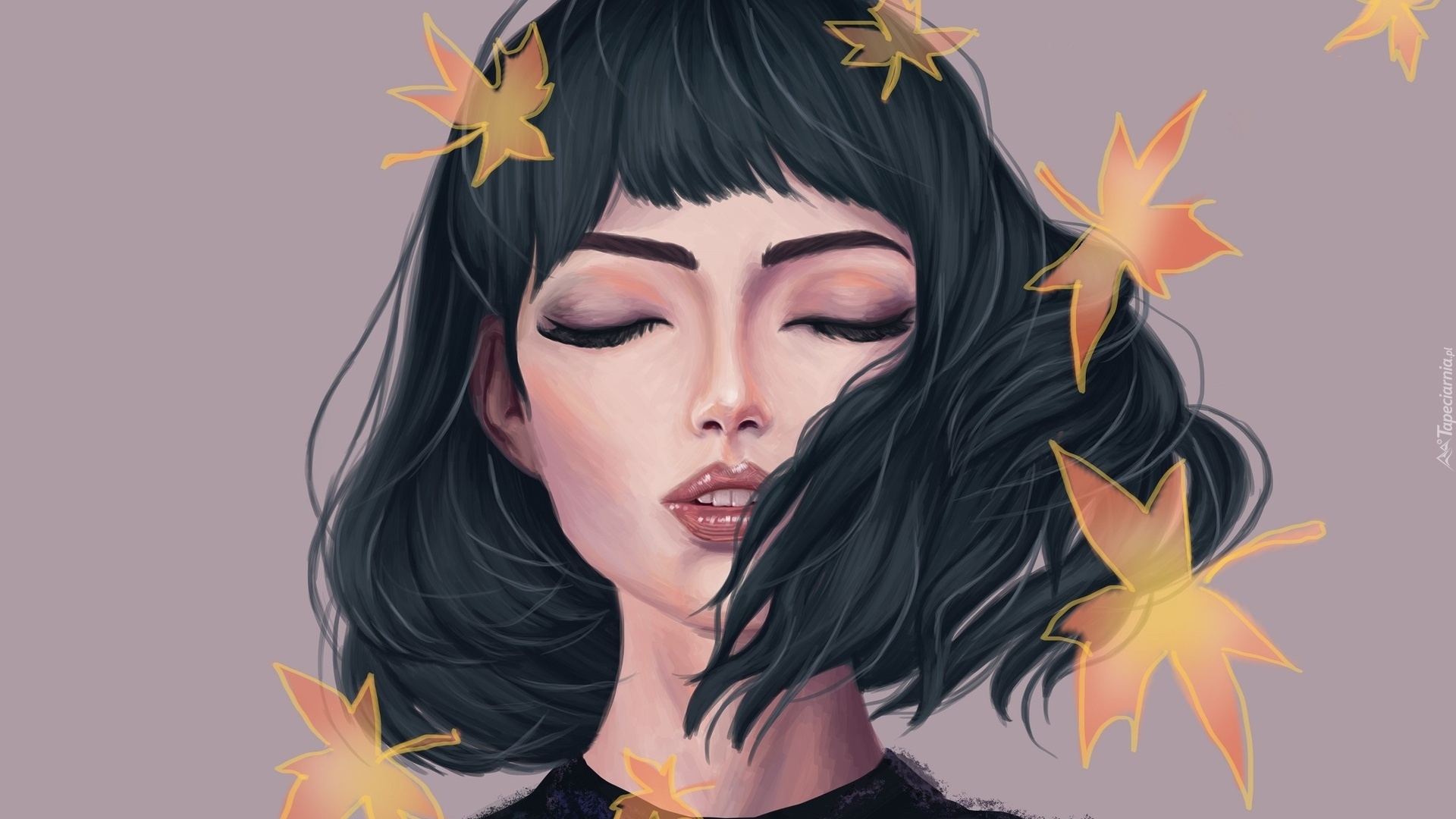 Edytor tapety: Ciemnowłosa dziewczyna z zamkniętymi oczami obok jesiennych liści