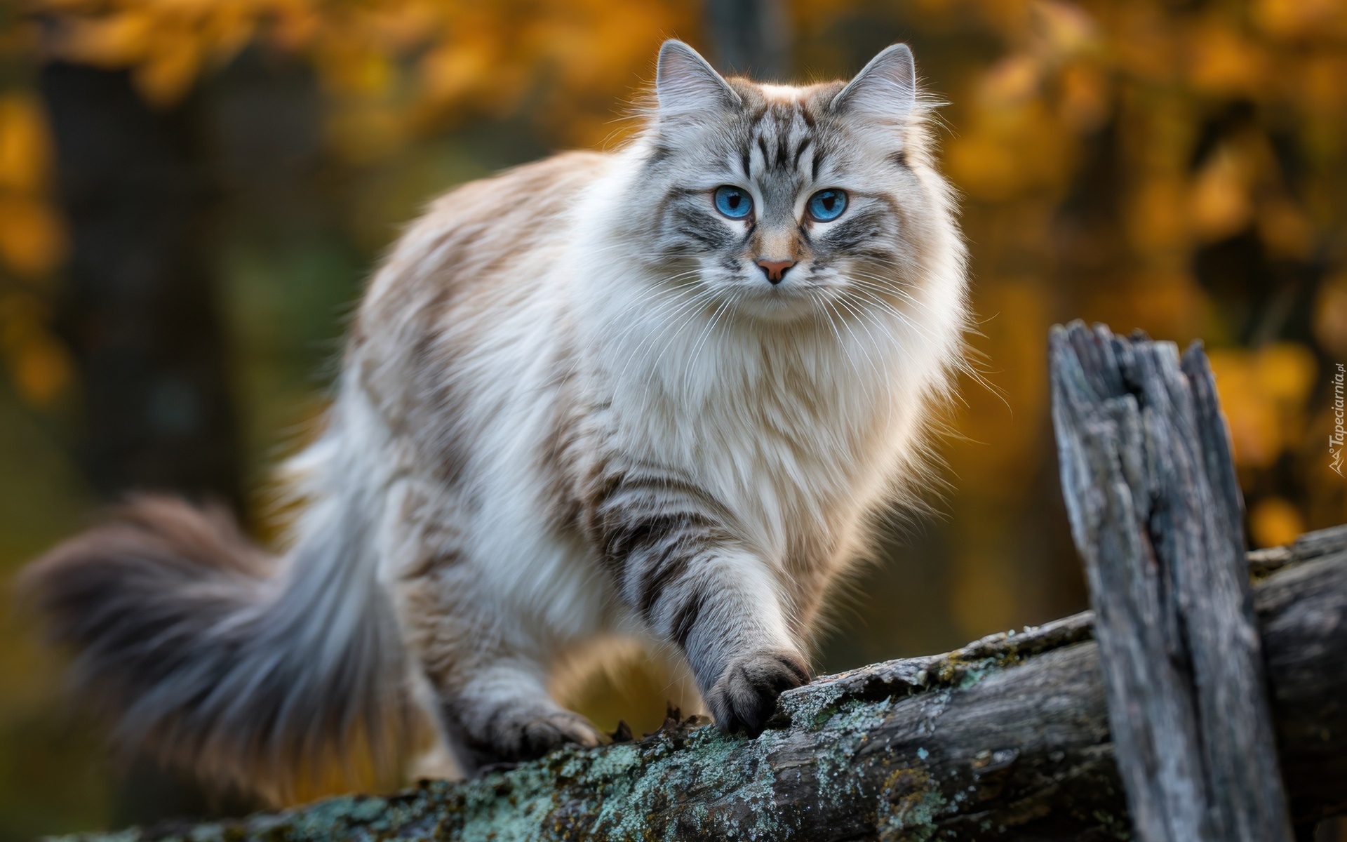 Edytor tapety: Biało-szary niebieskooki kot syberyjski na konarze