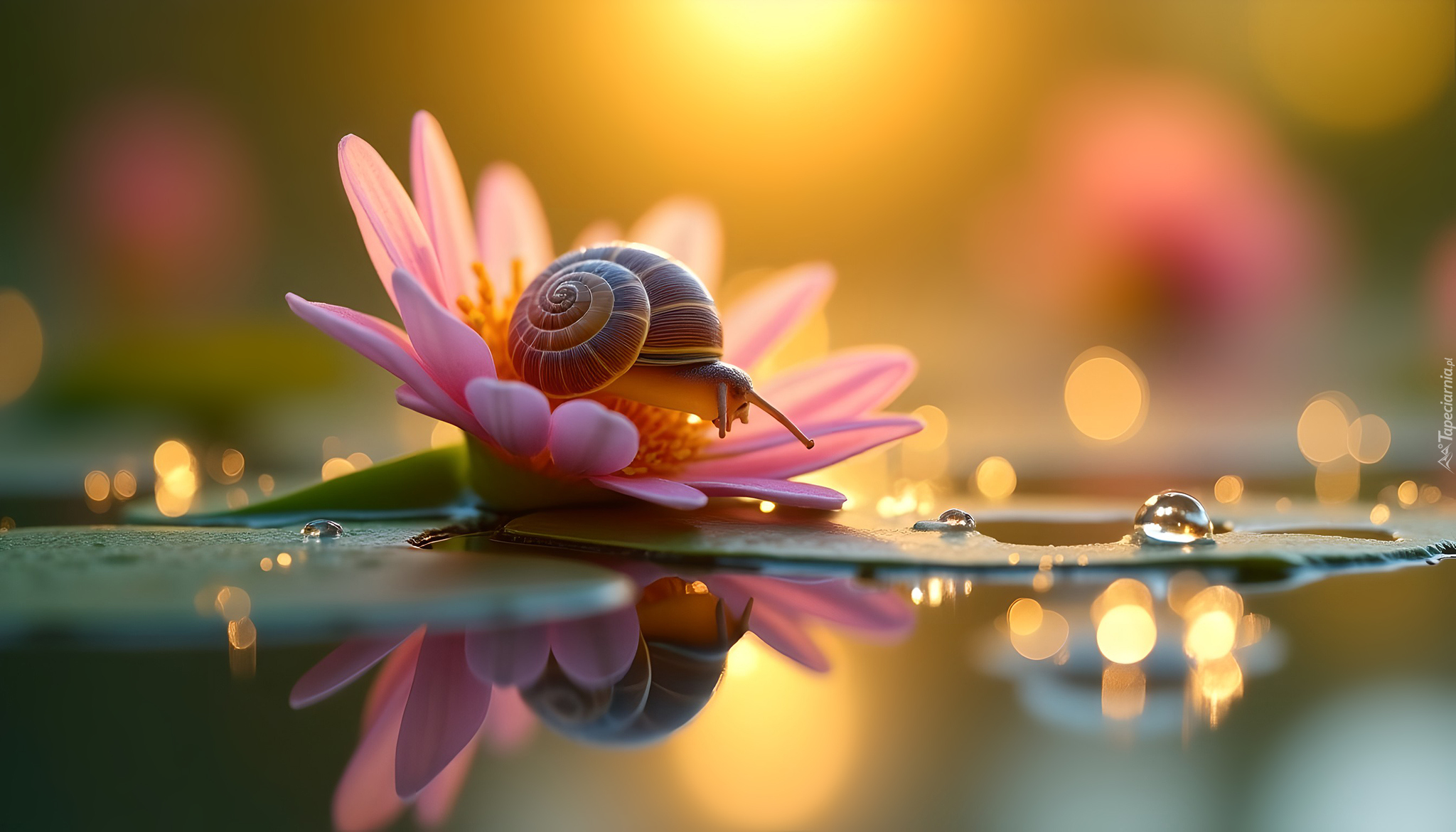 Edytor tapety: Ślimak na różowym kwiatku na słonecznym tle