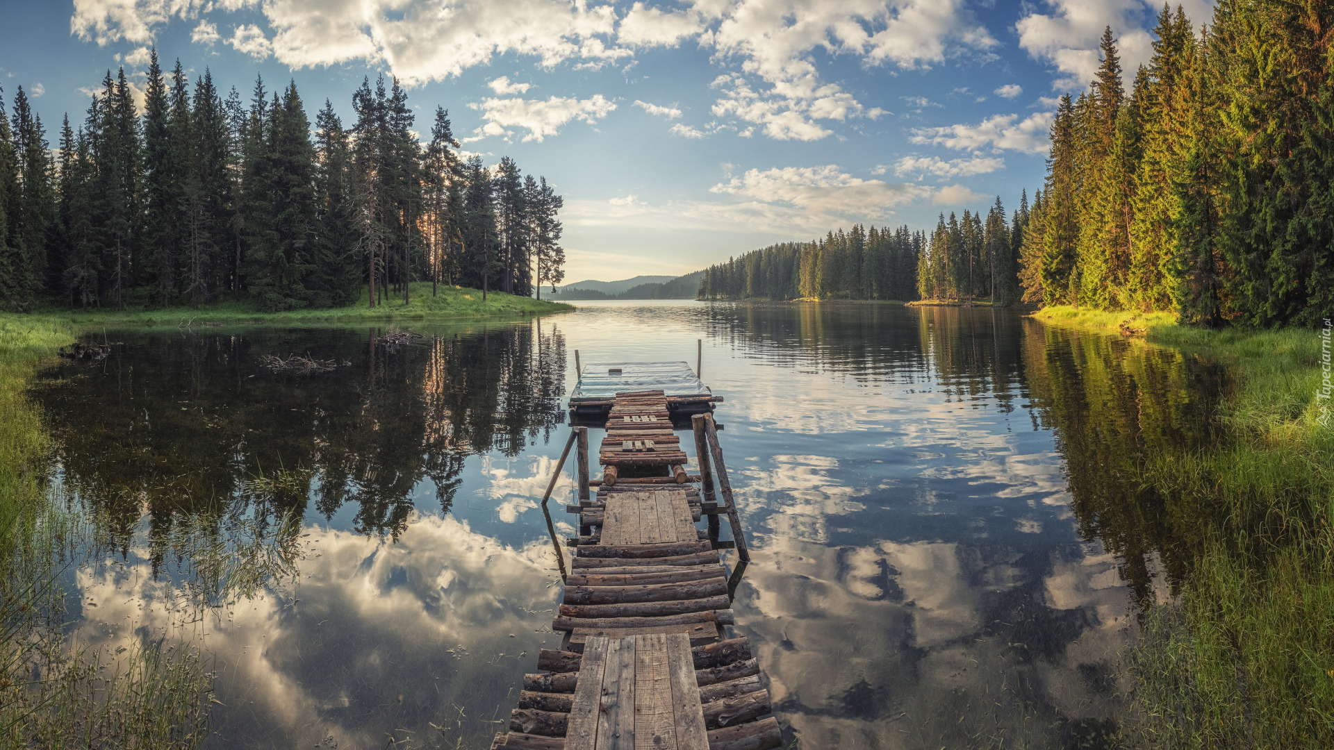 Edytor tapety: Drewniany pomost i drzewa nad jeziorem