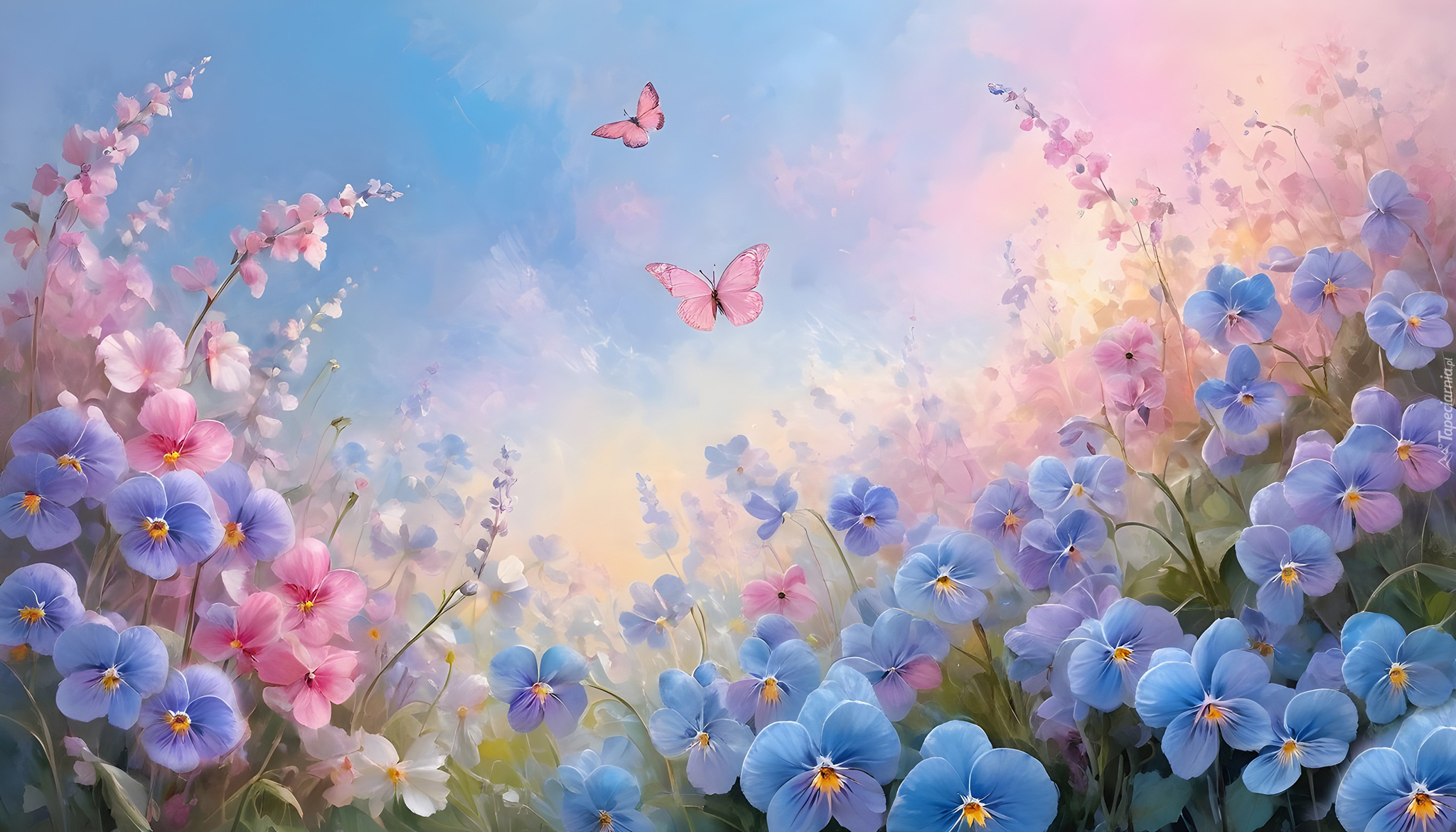 Edytor tapety: Motyle nad niebieskimi i różowymi kwiatami