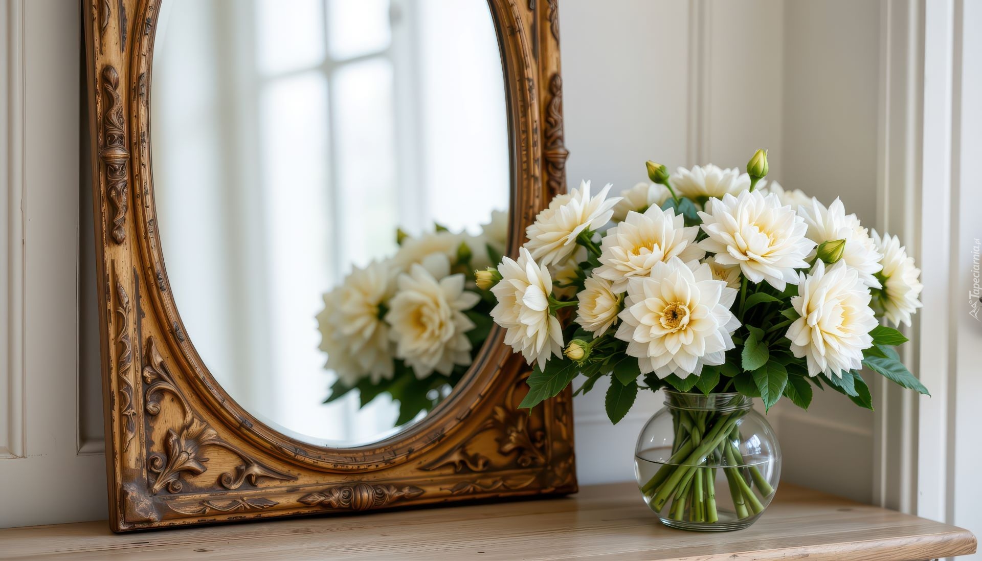 Edytor tapety: Bukiet białych kwiatów w szklanym wazonie obok lustra