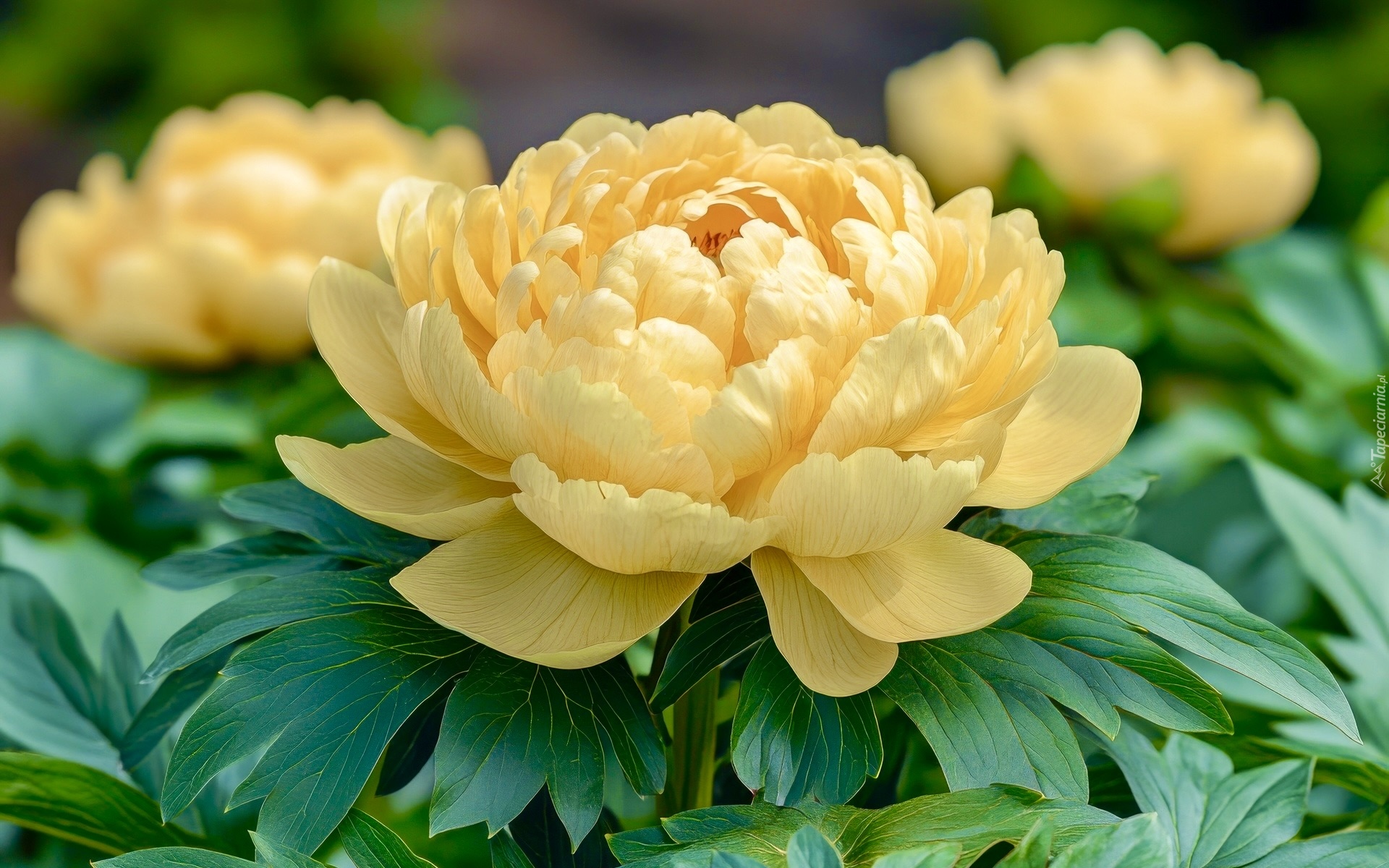 Edytor tapety: Rozkwitnięta żółta piwonia z liśćmi w zbliżeniu
