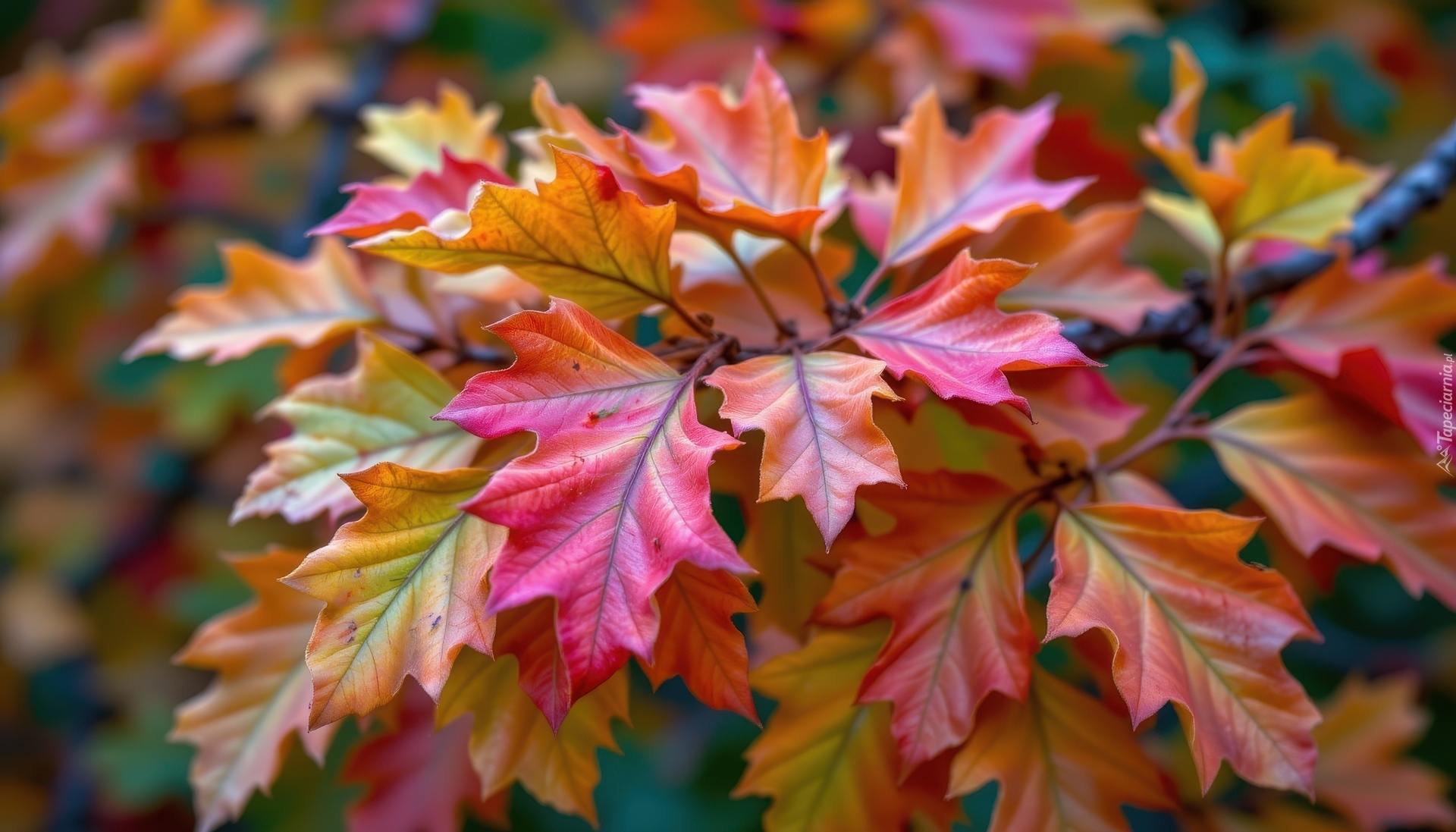 Edytor tapety: Kolorowe jesienne liście dębu na gałązce