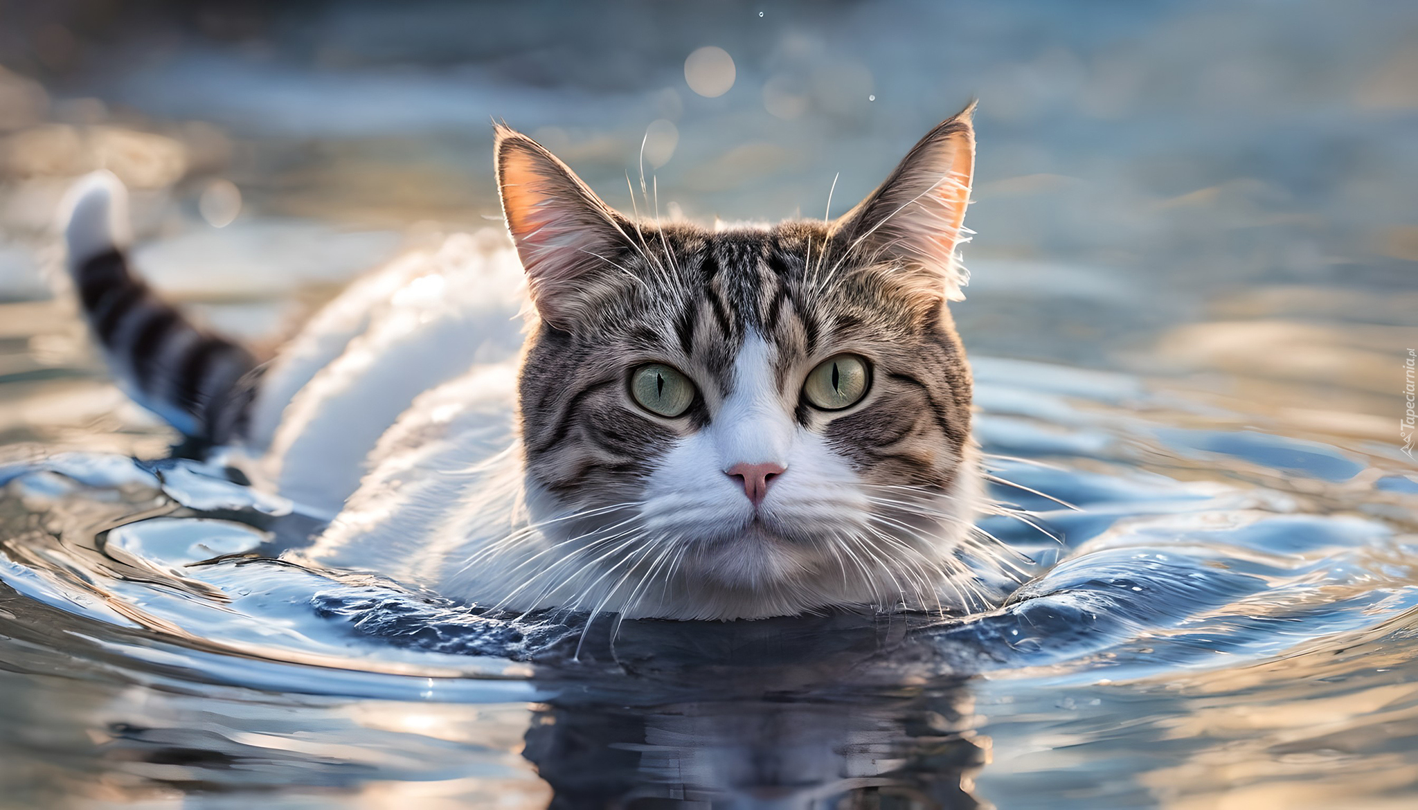 Edytor tapety: Biało-bury kot w wodzie