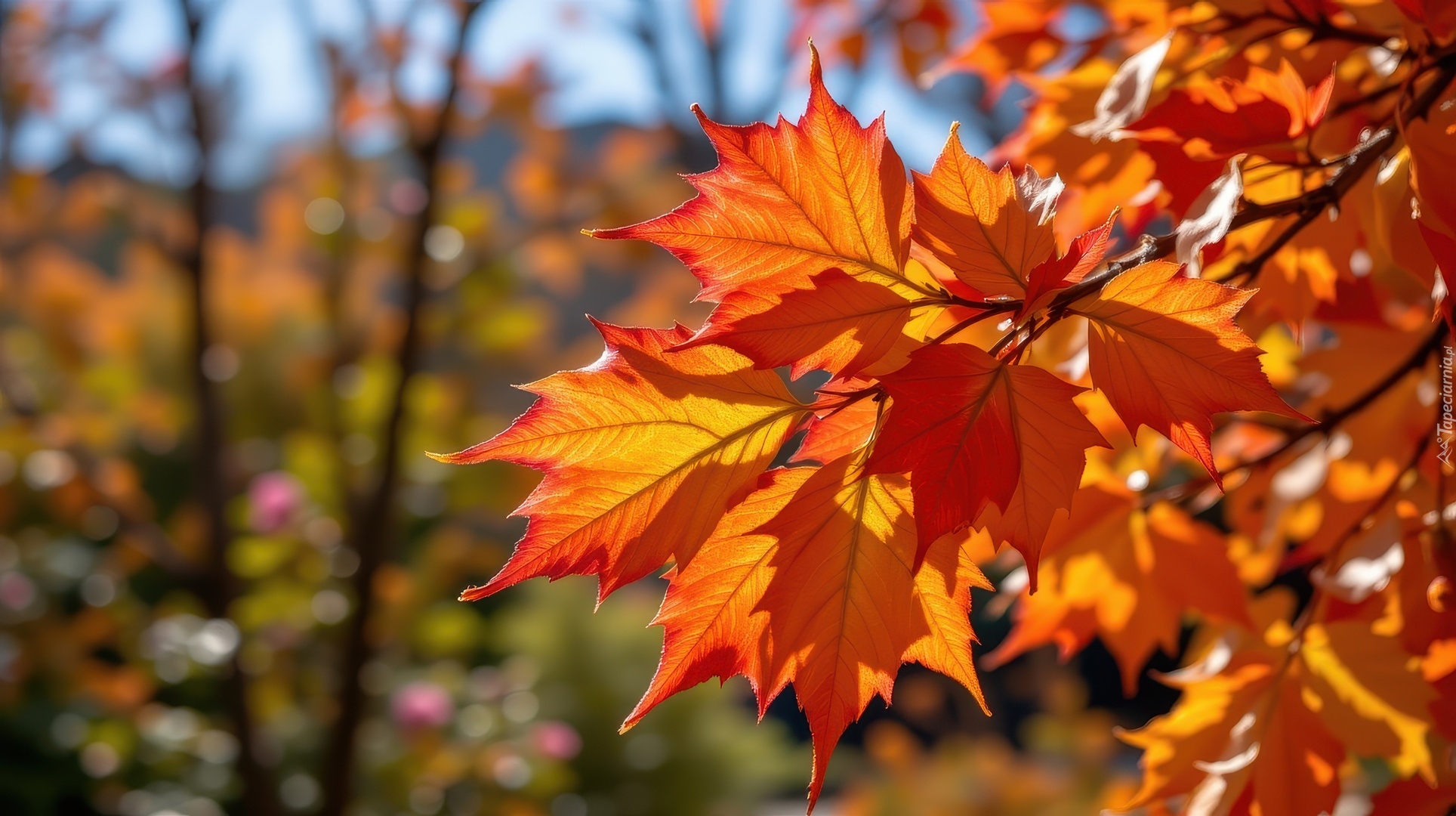 Edytor tapety: Rozświetlone słońcem pożółkłe liście na gałęziach
