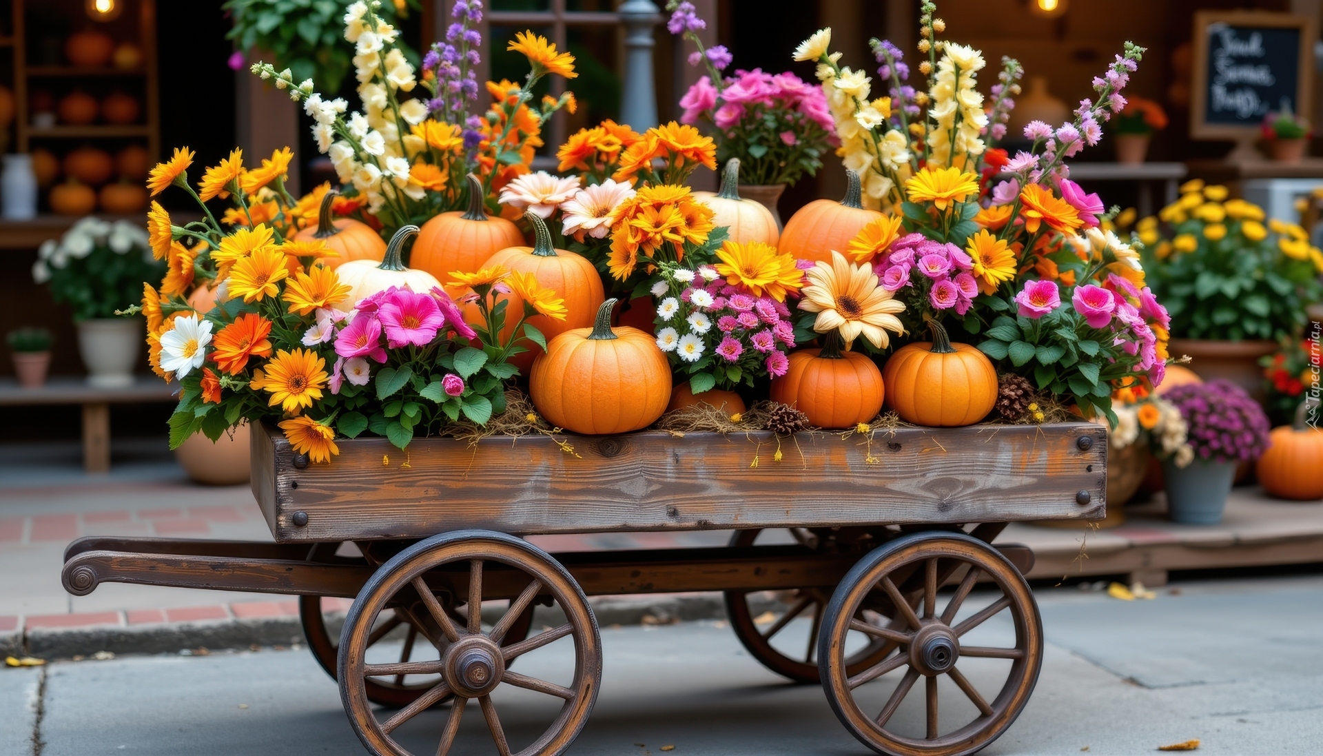 Edytor tapety: Drewniany wózek z dyniami i kolorowymi kwiatami