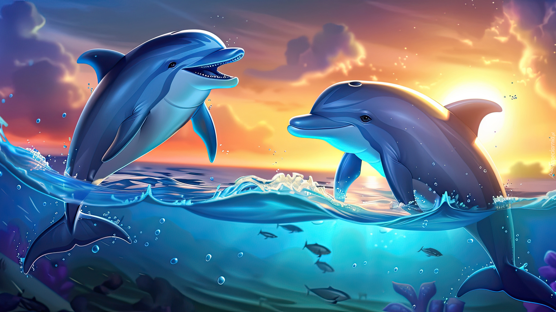 Edytor tapety: Dwa delfiny w morzu o zachodzie słońca