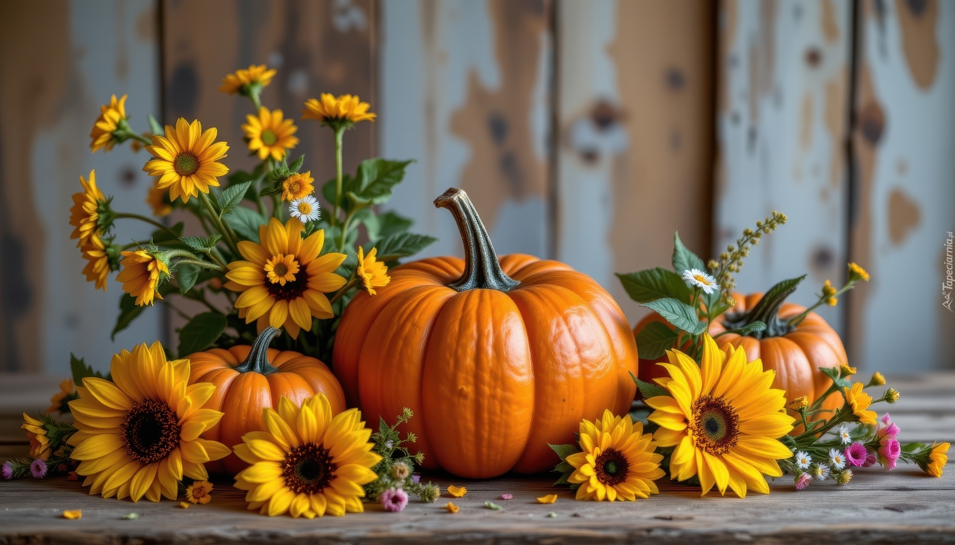 Edytor tapety: Trzy dynie i słoneczniki ozdobne na desce
