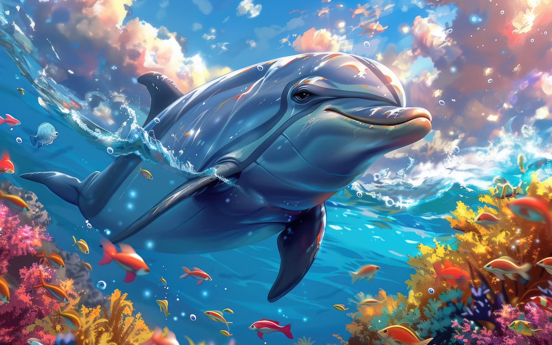 Edytor tapety: Delfin oraz rybki i kolorowe rośliny w wodzie