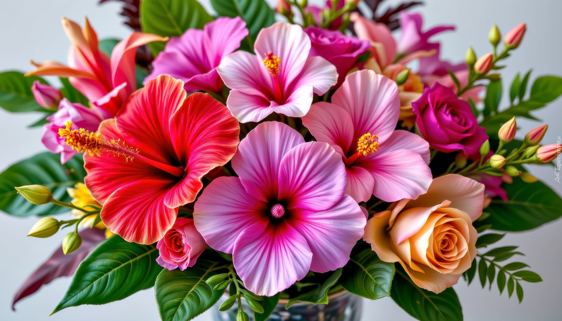 Edytor tapety: Bukiet z różami oraz kwiatami hibiskusa i liśćmi