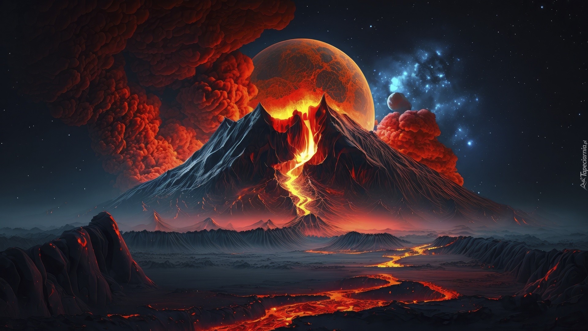 Edytor tapety: Erupcja wulkanu z księżycem w tle nocną porą