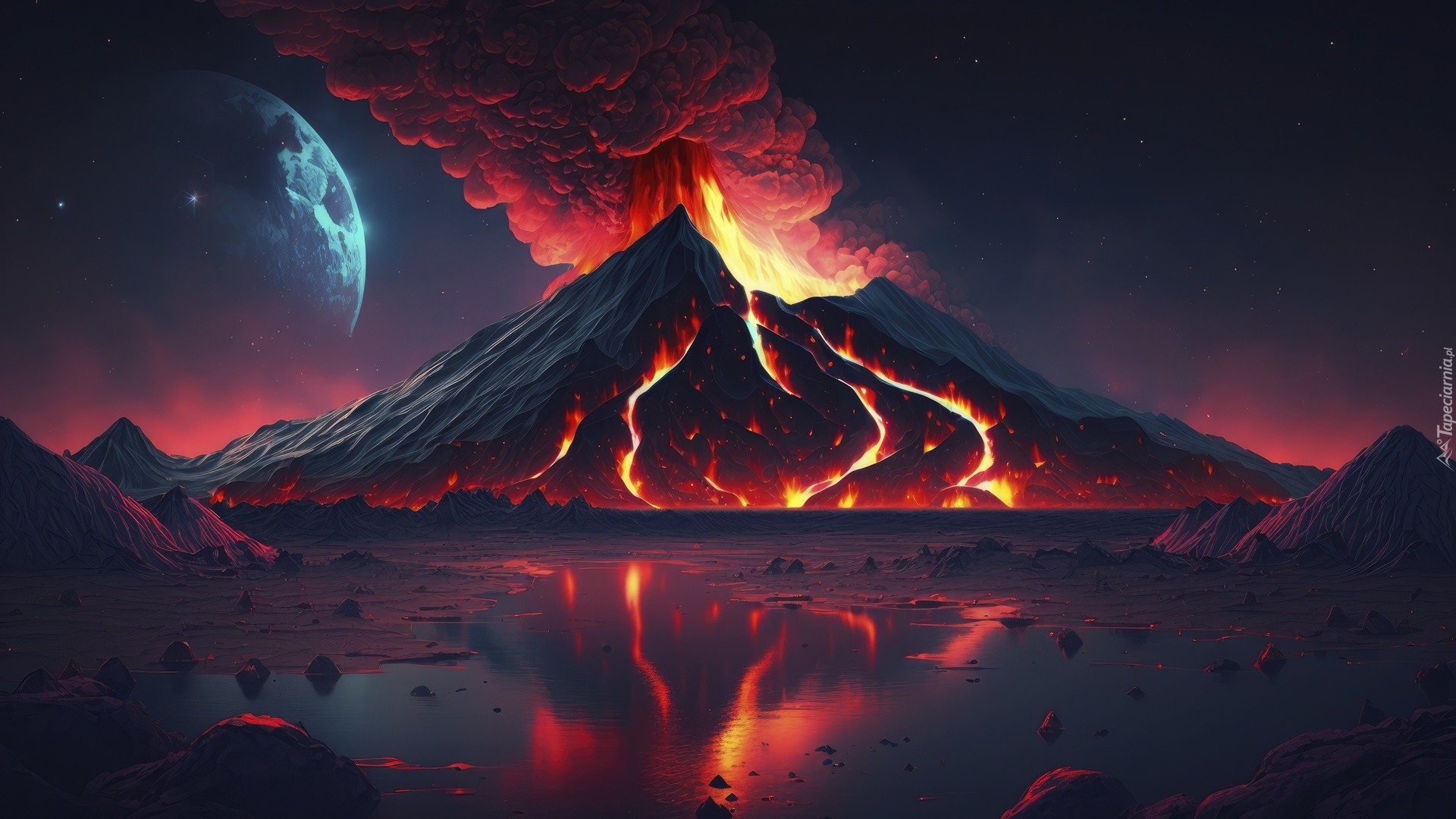 Edytor tapety: Odbicie w jeziorze erupcji wulkanu nocną porą