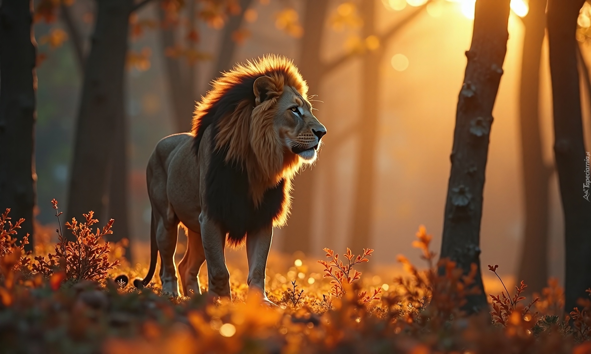 Edytor tapety: Lew w lesie w blasku zachodzącego słońca