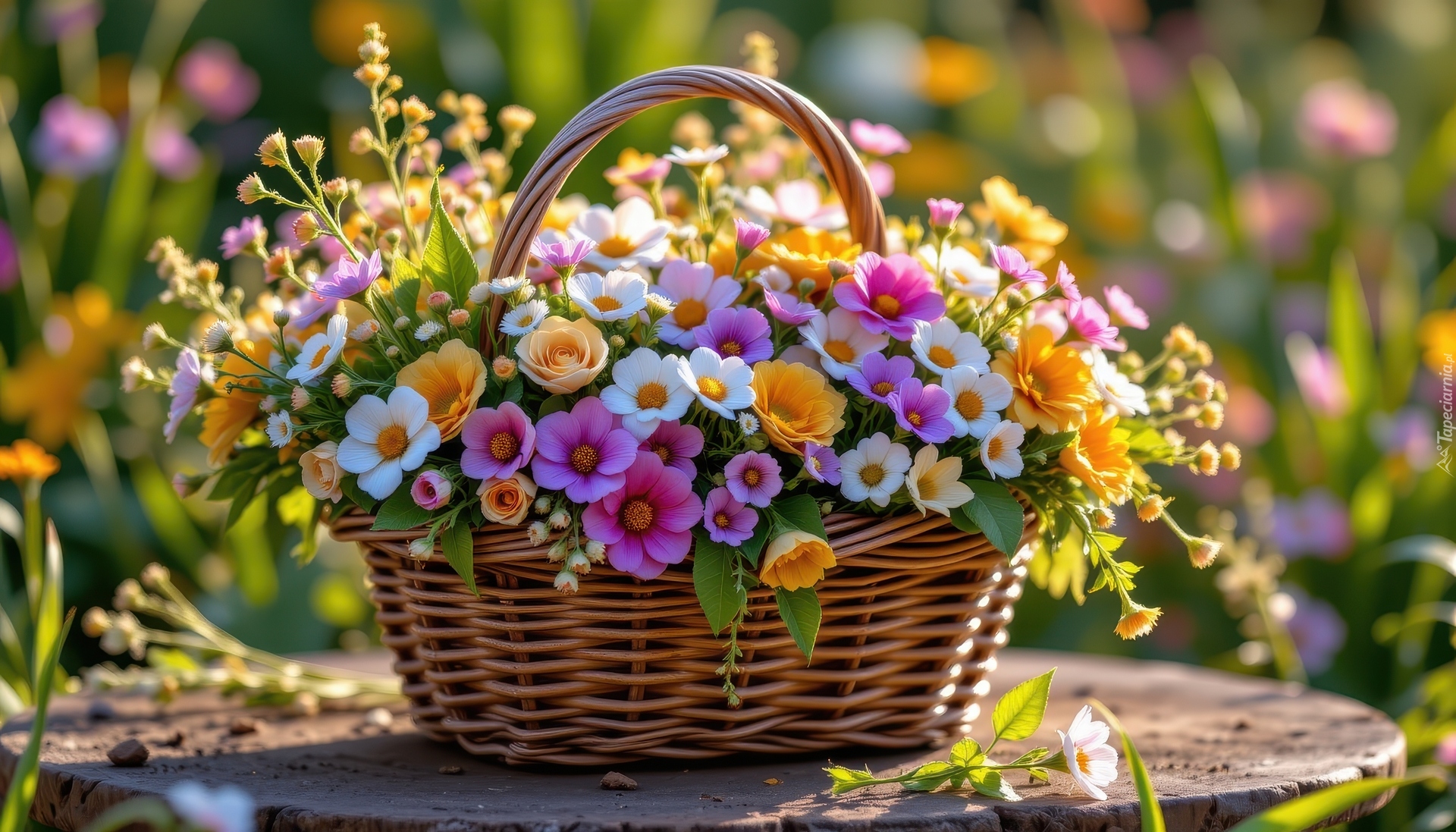 Edytor tapety: Rozświetlone słońcem kolorowe kwiaty polne w koszyku