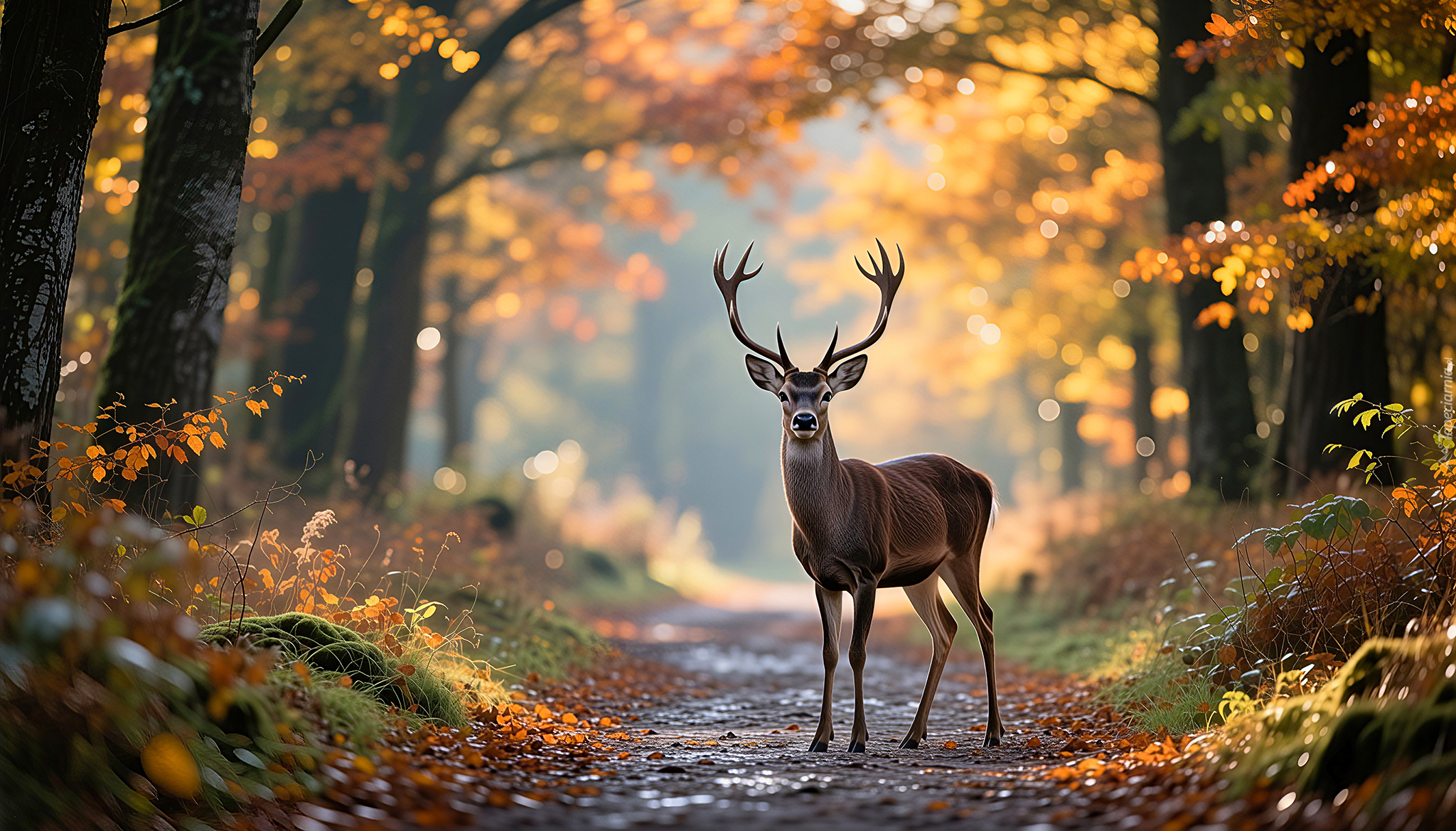 Edytor tapety: Jeleń stojący na leśnej ścieżce