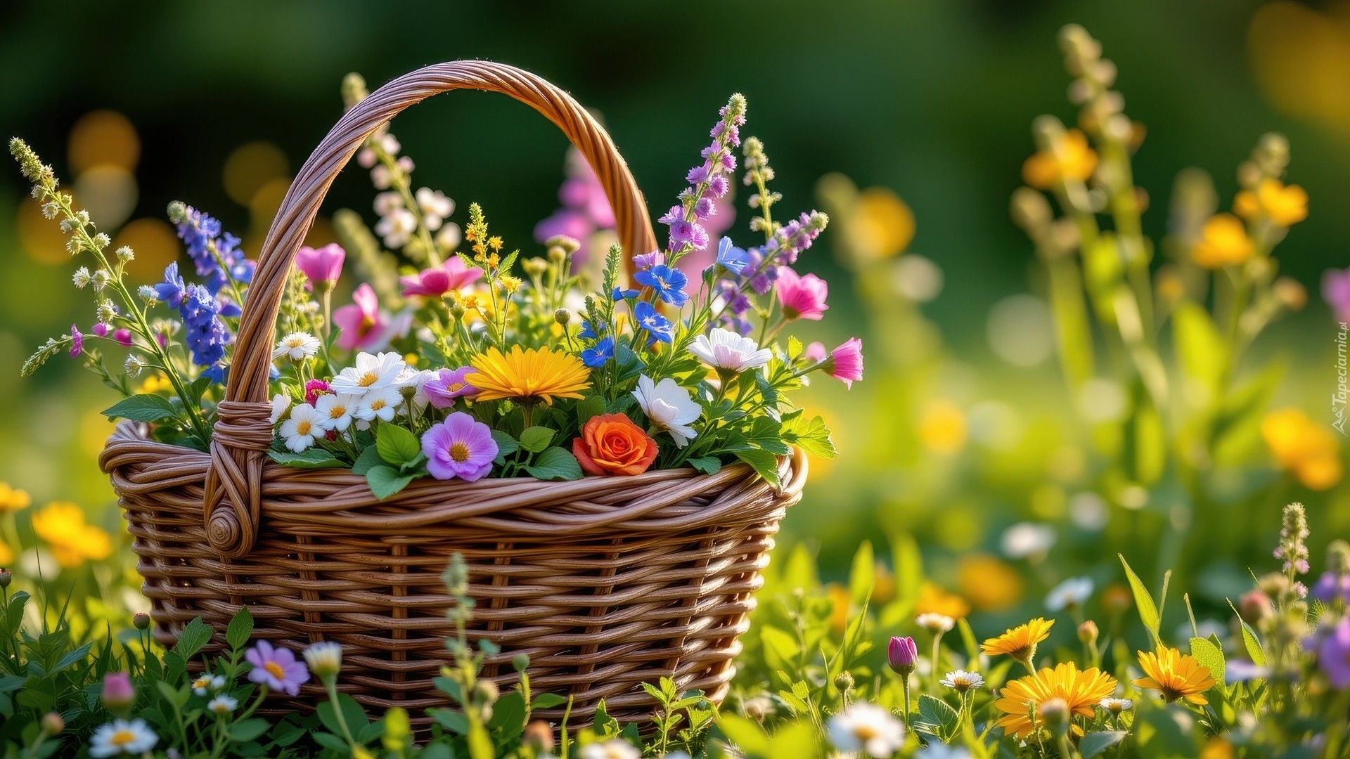 Edytor tapety: Koszyk z kolorowymi polnymi kwiatami na rozświetlonej łące