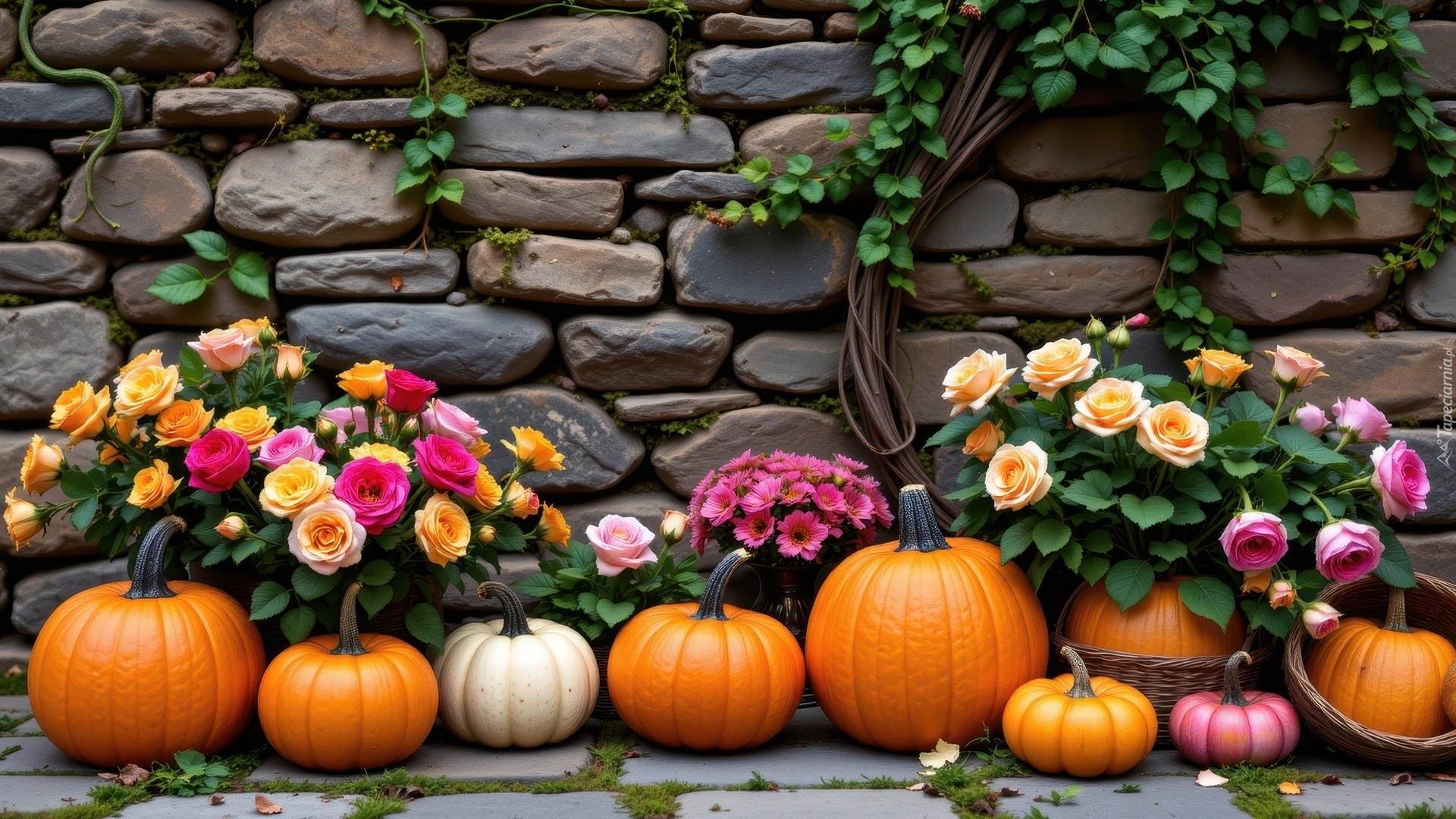 Edytor tapety: Dynie i kolorowe róże przy kamiennym murze