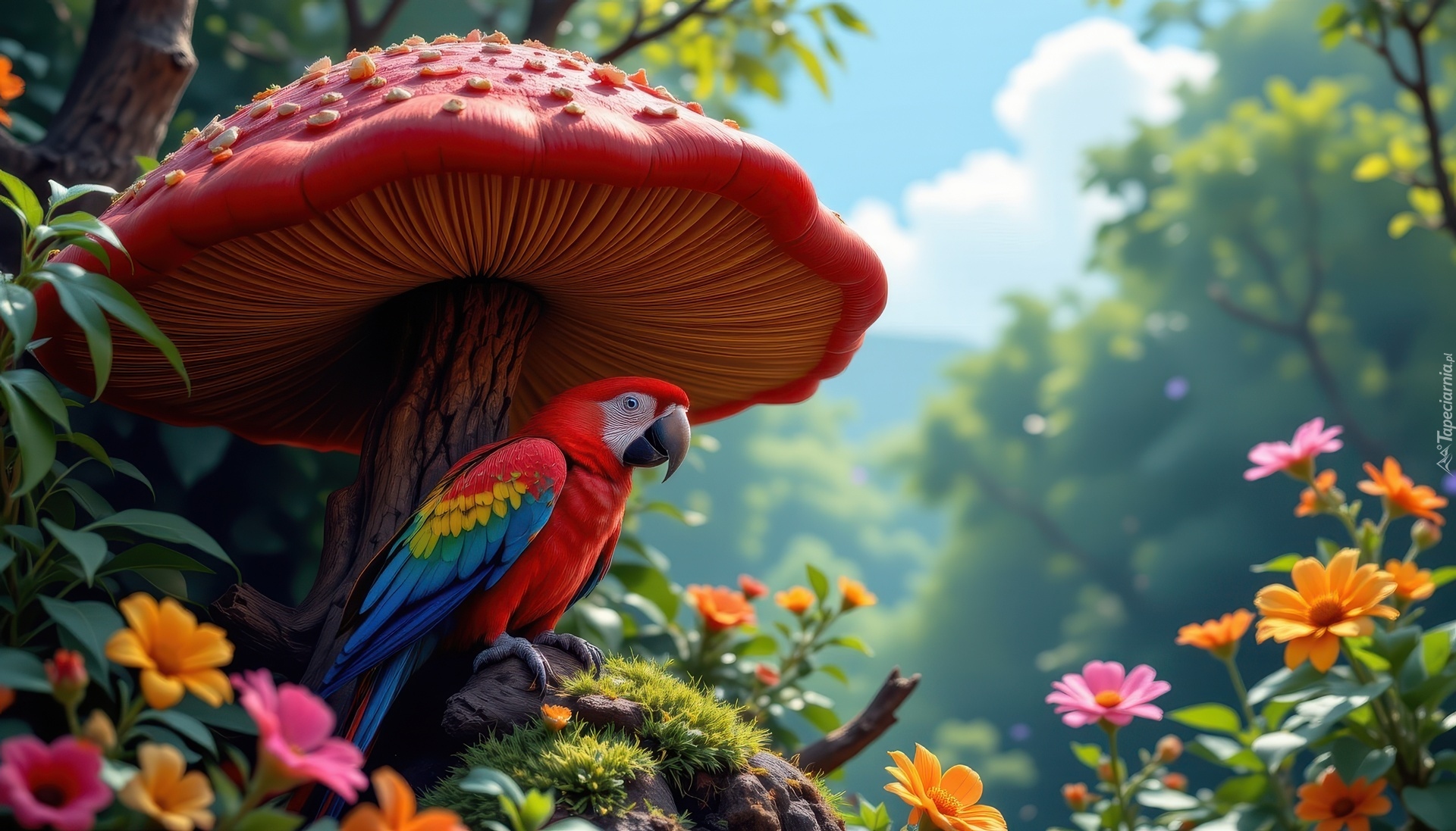 Edytor tapety: Ara stojąca pod czerwonym grzybem i obok kwiatów