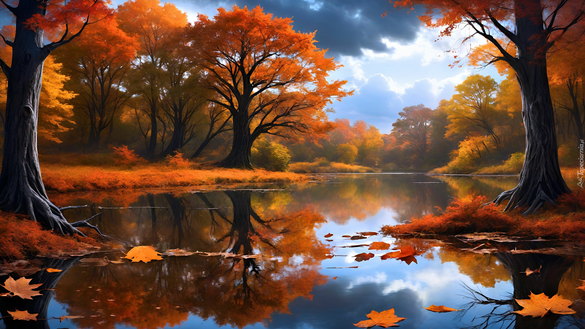 Edytor tapety: Jesienne drzewa nad stawem w grafice