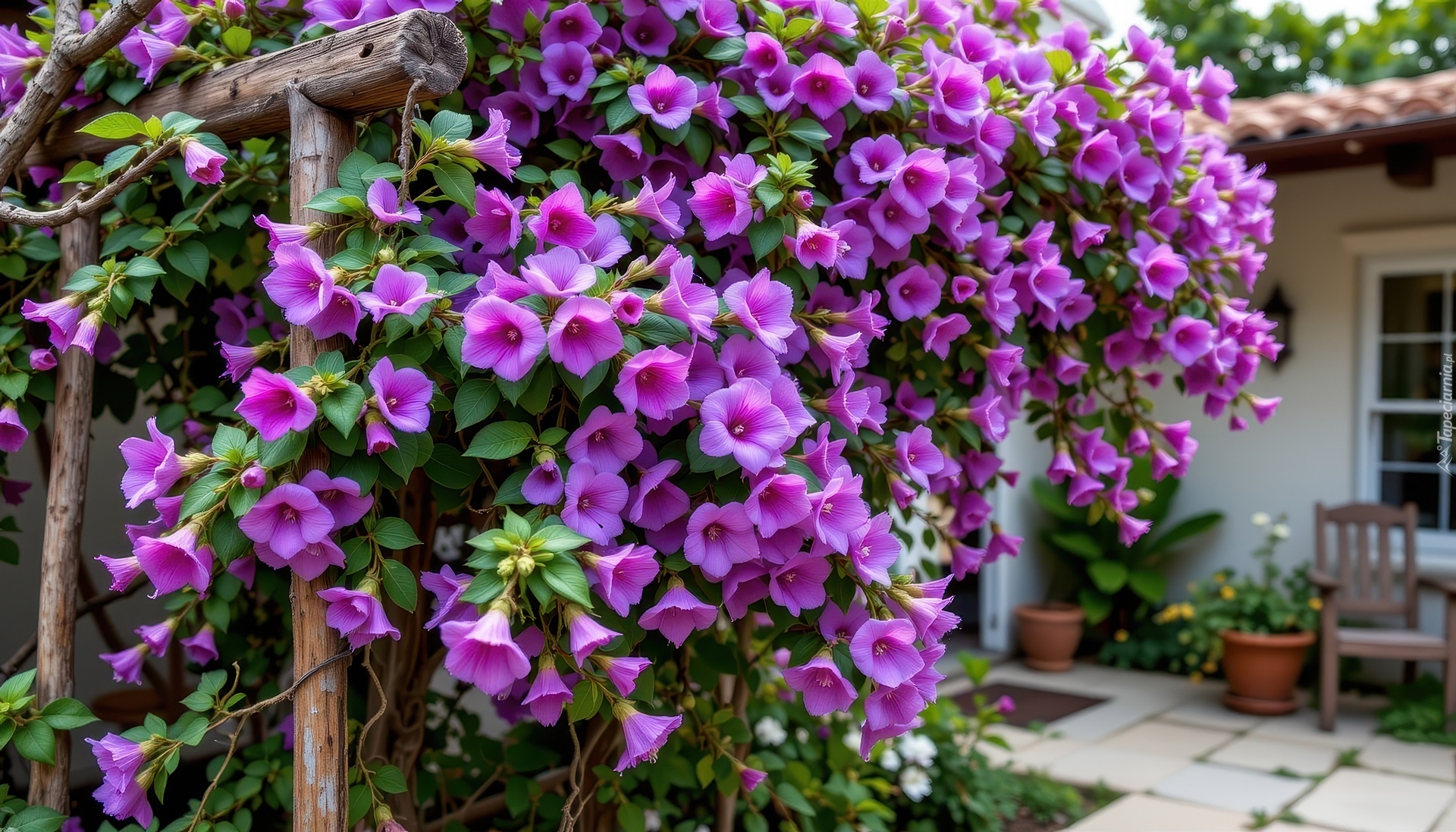 Edytor tapety: Pnące purpurowe kwiaty przed domem