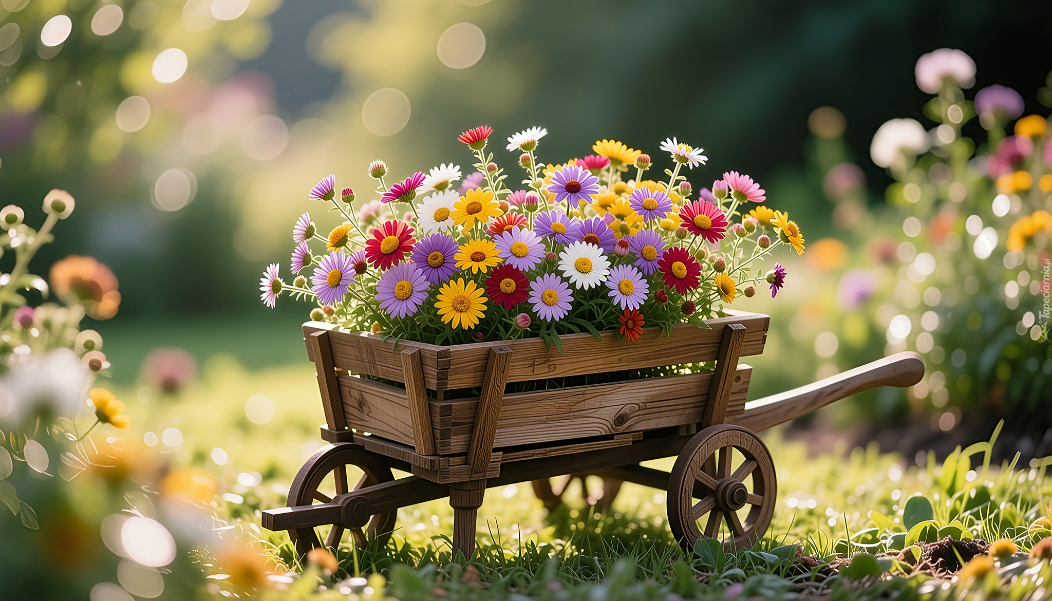 Edytor tapety: Trzykołowy wózek pełen kolorowych kwiatów w słonecznym ogrodzie