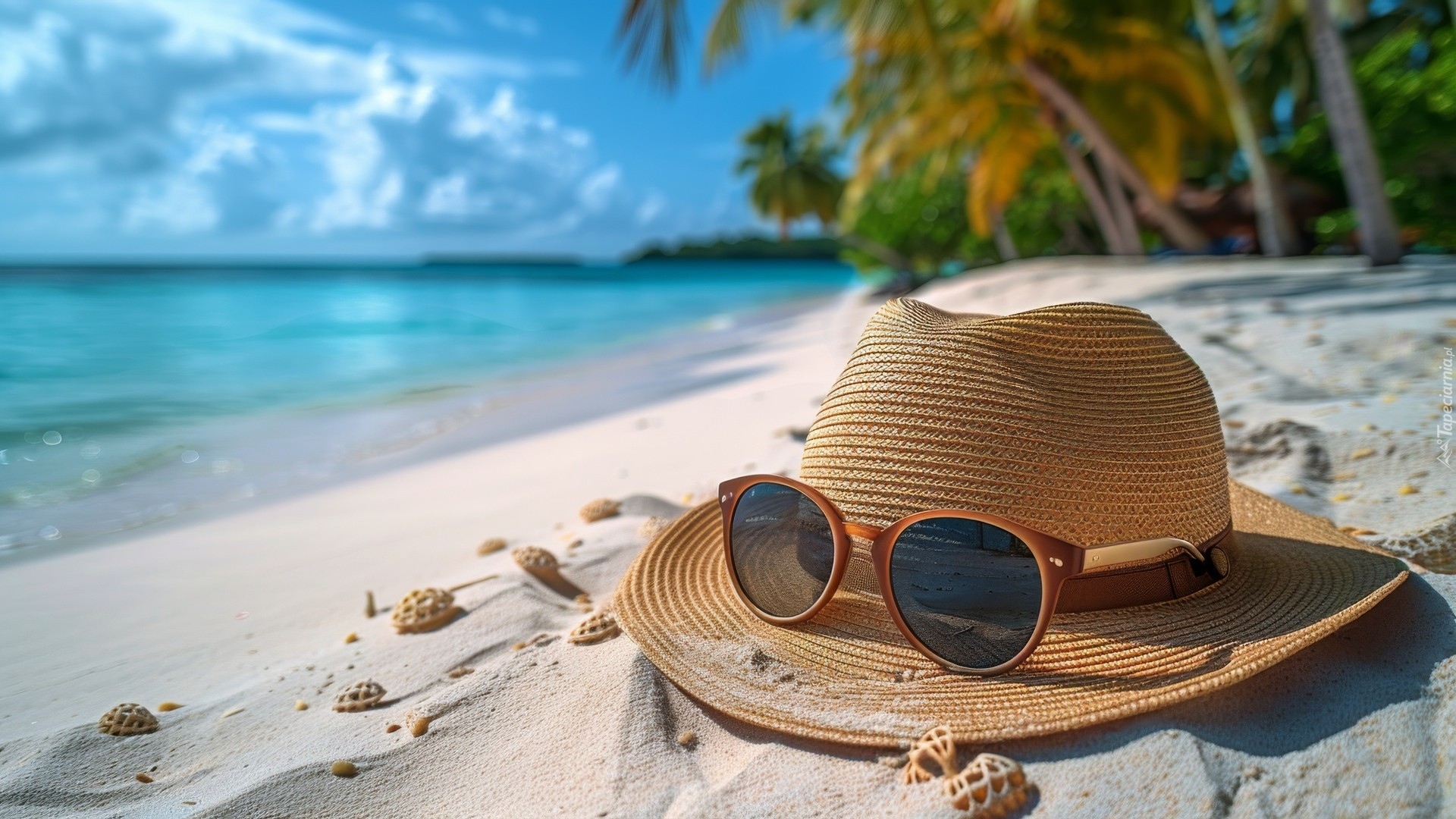 Edytor tapety: Kapelusz z okularami na piaszczystej plaży