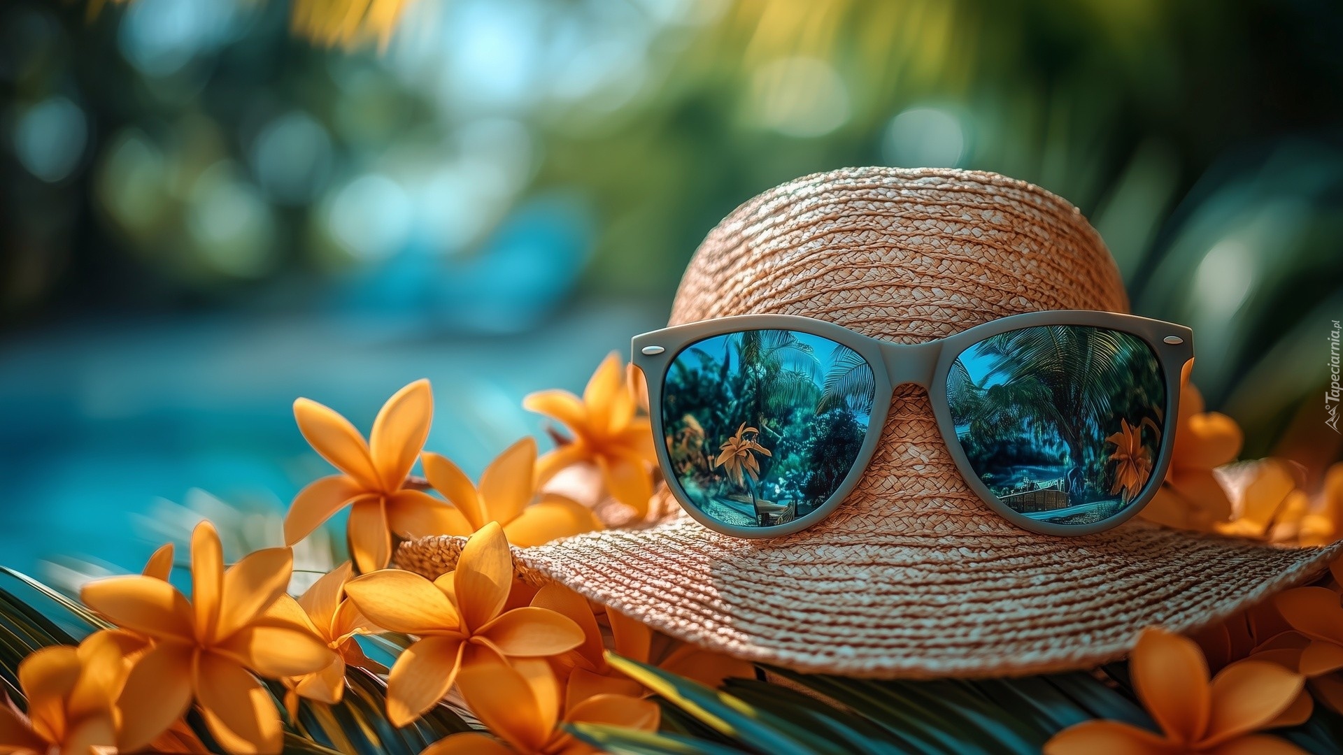 Edytor tapety: Kapelusz z okularami obok żółtych kwiatów plumerii