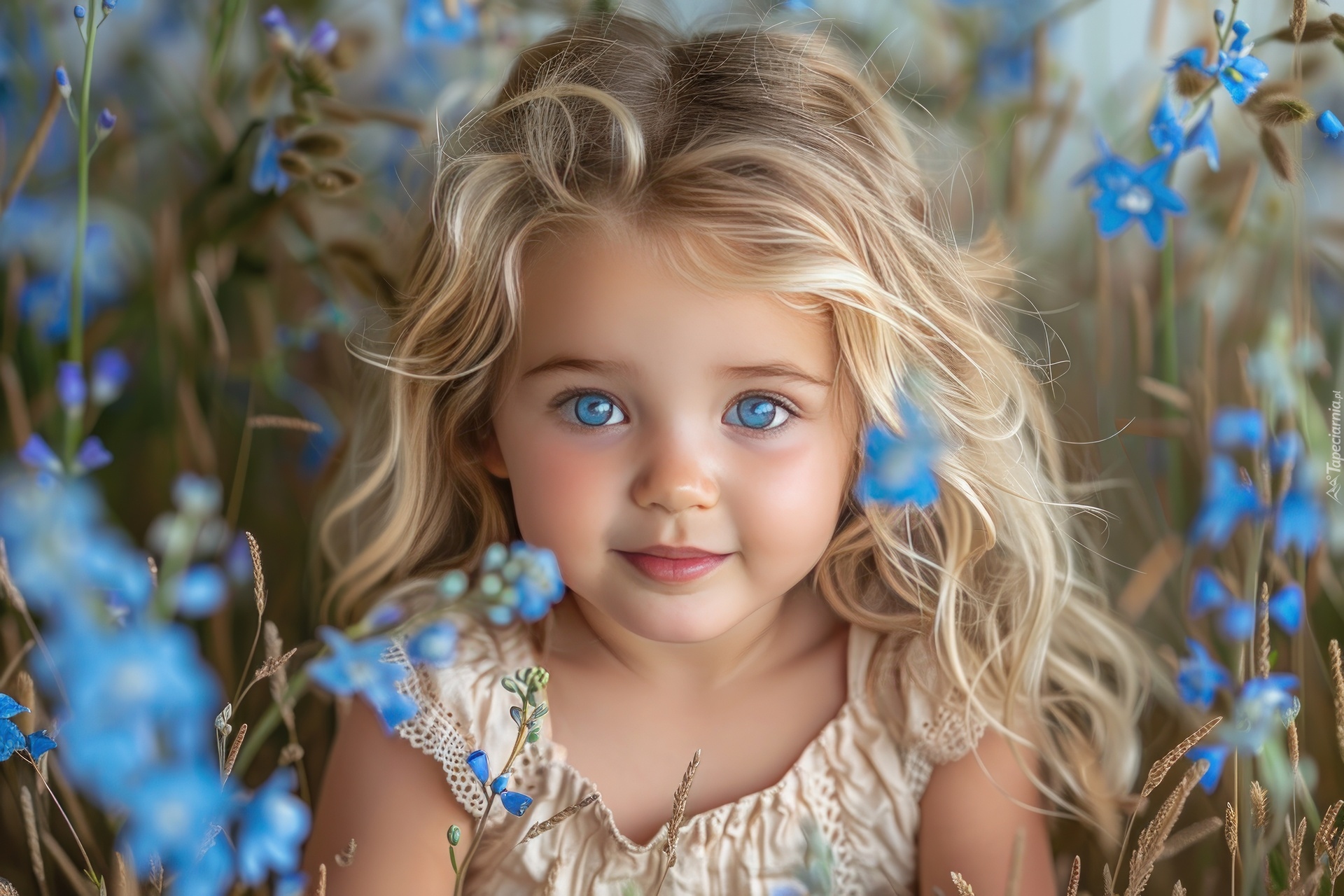 Edytor tapety: Niebieskooka dziewczynka o blond włosach wśród niebieskich kwiatów